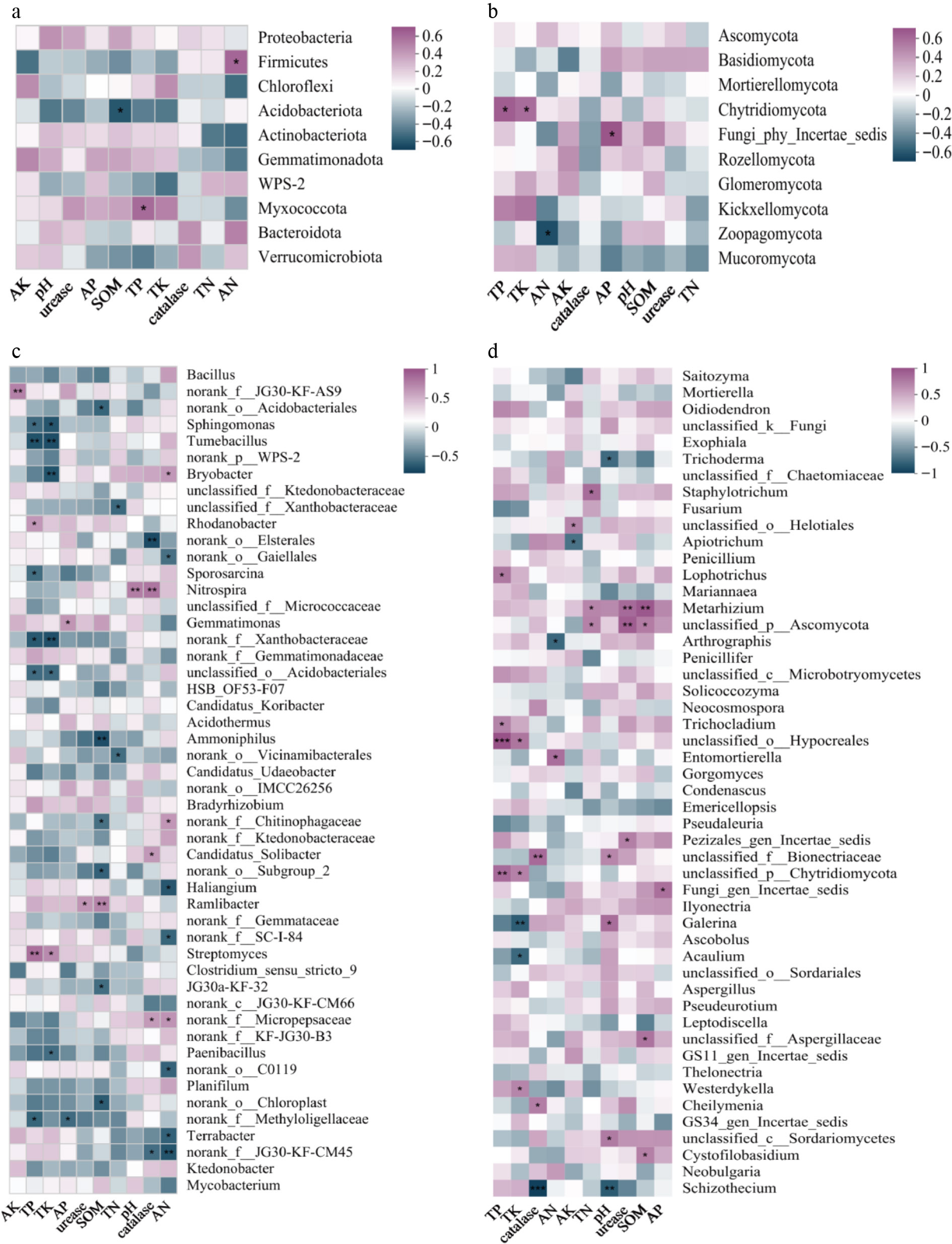 Correlation analysis between bacterial/fungal communities and soil physicochemical properties in tea plantation soils. (a), (b) Correlations at the phylum level for bacterial and fungal communities. (c), (d) Correlations at the genus level for bacterial and fungal communities. *, **, and *** indicate significance at p < 0.05, p < 0.01, and p < 0.001, respectively.