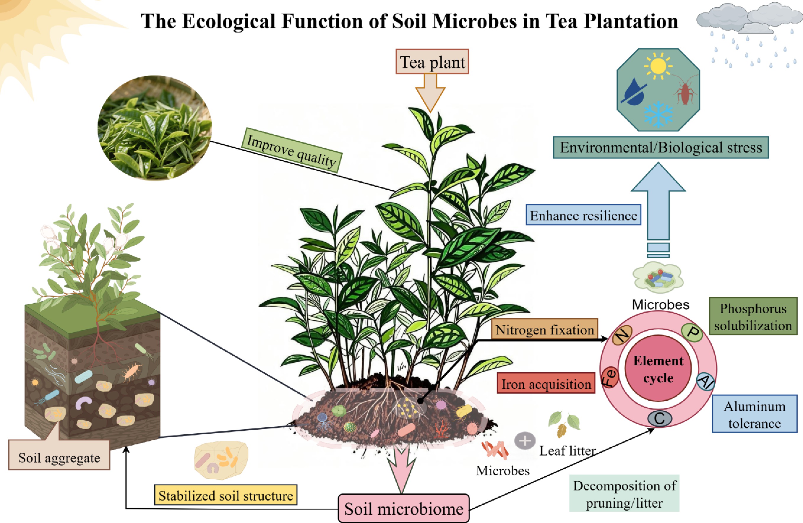 • The vast soil microbial community supports the coordination and functional performance of tea garden ecosystems. This review clarifies specific roles that soil microorganisms play in maintaining the stability of tea garden ecosystems. Soil microorganisms facilitate nutrient cycling within tea gardens, which is essential for plant growth and ecosystem sustainability. They mediate processes such as N fixation, P solubilization, Fe acquisition, Al tolerance, and the decomposition of prunings and litter, thereby promoting the cycling of elements like C, N, and P (Fig. 1). By breaking down organic matter, microorganisms release nutrients that tea plants can absorb, while also engaging in biogeochemical processes that sustain soil fertility during continuous cropping. For instance, N-fixing microorganisms help reduce N limitations in tea plantation soils, which are often acidic and tend to immobilize nutrients, whereas P-solubilizing microorganisms convert insoluble inorganic and organic P into forms that are accessible to tea plants' roots (Fig. 1). Soil microbial activity encourages the formation of soil aggregates, thereby enhancing soil porosity, water retention, and aeration. This stable soil structure, in turn, provides a beneficial habitat for microorganisms and tea plants, establishing a positive feedback loop in the ecosystem (Fig. 1). Soil microorganisms are crucial in improving tea's quality and helping plants withstand stress. They regulate the nutrient supply and soil chemistry, affecting the production of important secondary metabolites in tea leaves such as catechins, amino acids, and volatile compounds, which shape tea's flavor, aroma, and health benefits (Fig. 1). Moreover, they bolster tea plants' resilience against environmental challenges and pests like drought, extreme temperatures, and pathogen infections by triggering systemic immunity and releasing antimicrobial substances (Fig. 1). This stress tolerance is vital for maintaining tea production in the face of increasing climate change and biological threats.