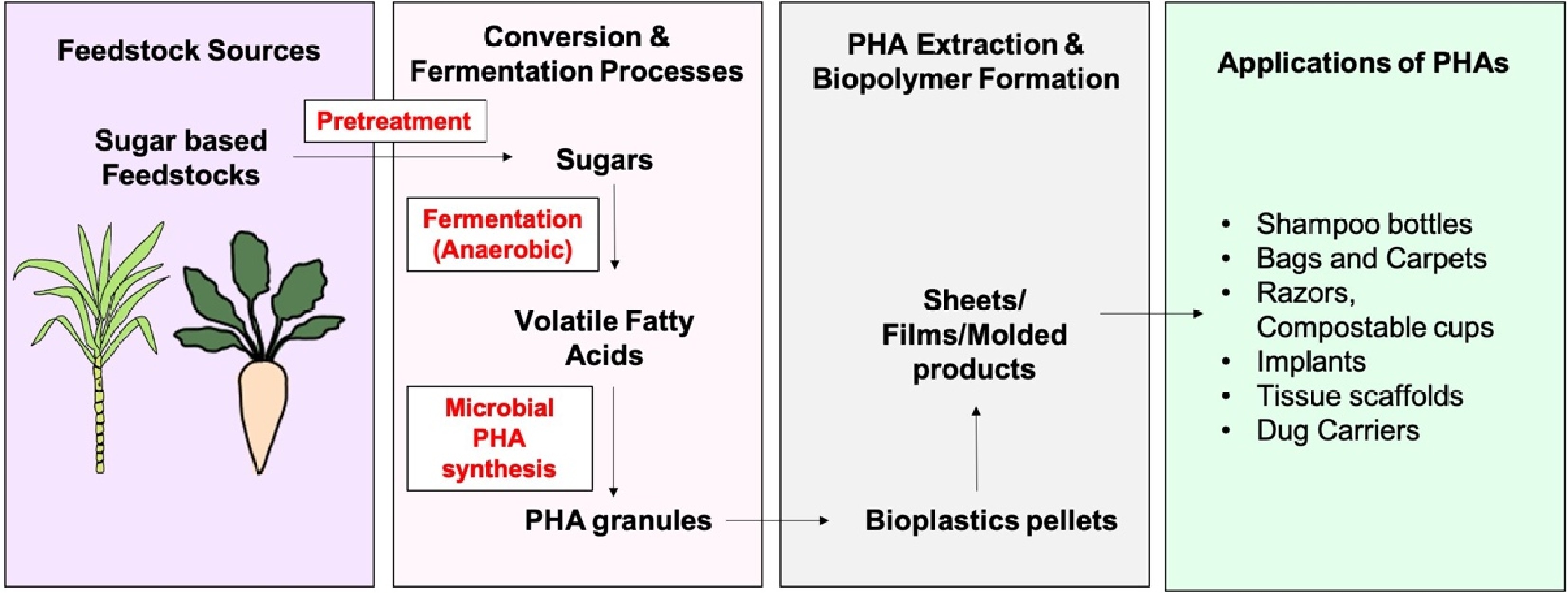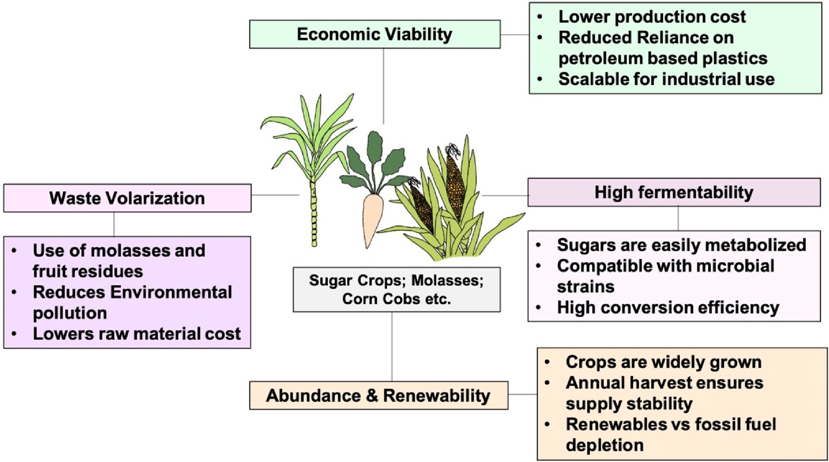 • The application of PHAs have been reported in several areas, from daily use to specialized uses like in biomedicals. Research opportunities in PHAs production have been gaining speed with advancements in genome engineering techniques. Discovering alternative carbon sources is key to maintaining sustainable production methods. With the characteristics of renewability, abundance, microbial compatibility, cost-effectiveness, and eco-friendly, the sugar rich feedstock have become essential for the sustainable and efficient production of PHAs with higher yields. These sugar-based substrates can significantly reduce the carbon footprint of PHAs compared to petroleum based substrates. Moreover, these also support the circular economy perspective by the creation of value-added products. The integration of these feedstocks in PHAs production processes through biotechnological tools have also impacted the existing agricultural practices and utilization of infrastructures in such processes. This shift results in more sustainable bioplastic manufacturing, compared to traditional ones. Additionally, since these feedstocks are obtained from waste/by-products of sugar-based crops, they are easily available in sufficient quantity, thus reducing the dependency on imported raw materials and supporting local economies. PHA production from these feedstocks is a positive and practical approach for the problem of plastic pollution and resource depletion, leading towards the attainment of sustainable development goals.