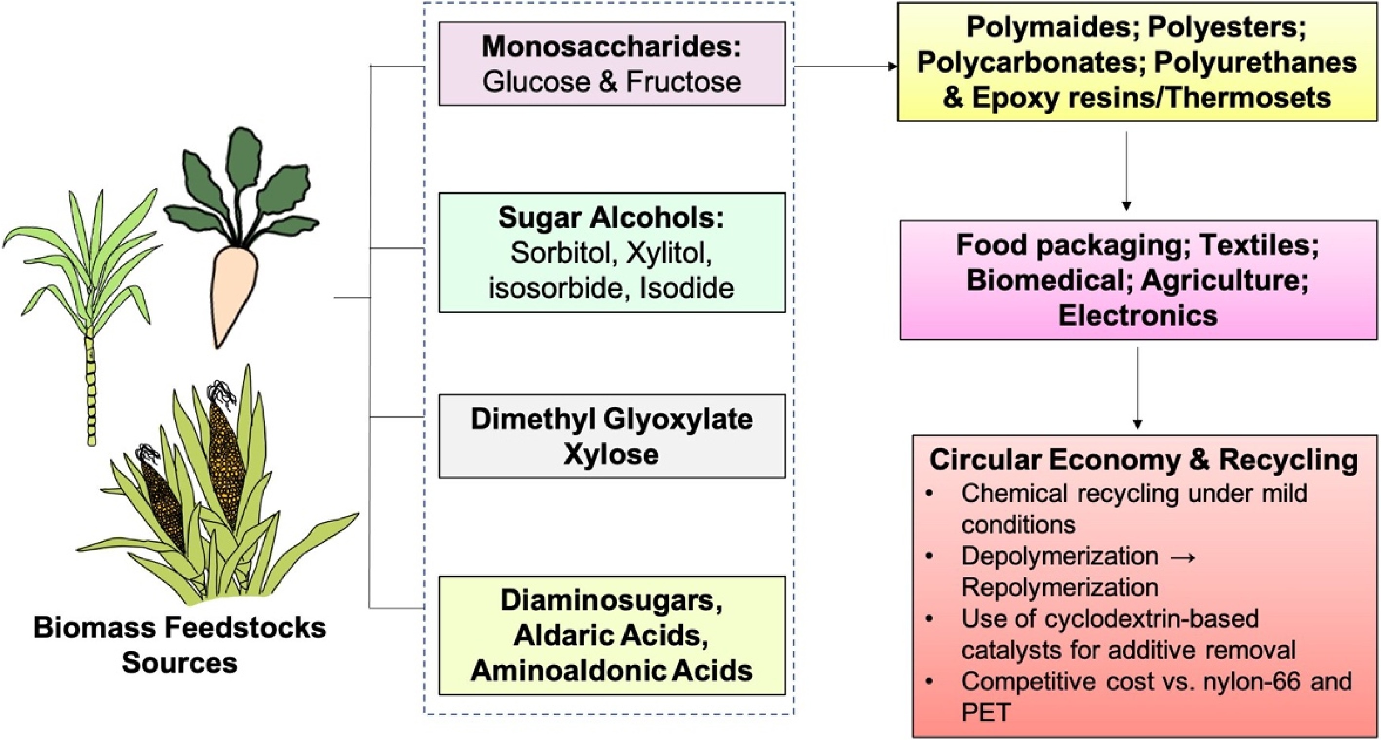 Cost and scalability are issues, but enzymatic and microbial production of sugar-based monomers, coupled with sugar biorefineries, increases feasibility. Recyclability tests show maintained tensile strength, and chemical recyclability under mild conditions[205]. Firms such as Bloom Biorenewables, a spin-off from EPFL, are working towards commercial-scale production. Sugar-based catalysts such as cyclodextrins improve upcycling and recycling by eliminating additives, maximizing yield and purity[206,207]. Generally, sugar-derived polymers such as polyamides, polyesters, polycarbonates, and epoxy resins provide adjustable functionality, recyclability, and compliance with circular economy doctrine, making them ideal for packaging, biomedical, and high-performance applications with prospects for sustainable reform of the plastics sector[208].