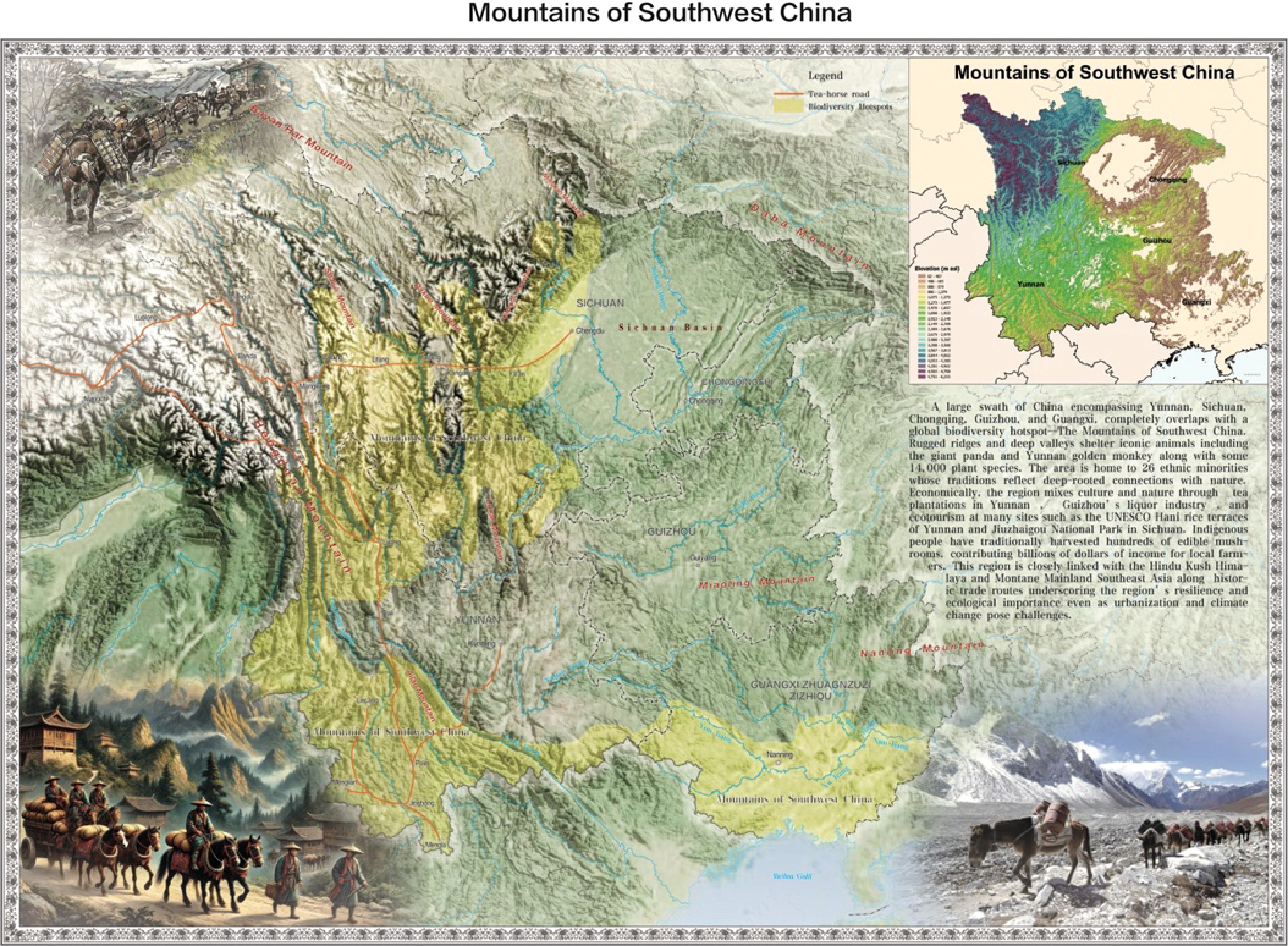 A large swath of southwest China completely overlaps with a global biodiversity hotspot—the Mountains of Southwest China (Fig. 1). Rugged ridges and deep valleys shelter many primate species along with some 14,000 plants. The area is home to 26 ethnic minorities whose traditions are tied to the land. Economically, the region mixes tea plantations with ecotourism at many protected natural and cultural areas. This region remains linked with Montane Mainland Southeast Asia, and the Hindu Kush Himalaya along historic trade routes, underscoring cross-border resilience. However, biodiversity here is under intense human pressure due to spreading monoculture plantations of commercial crops, urbanization, and climate change[19].