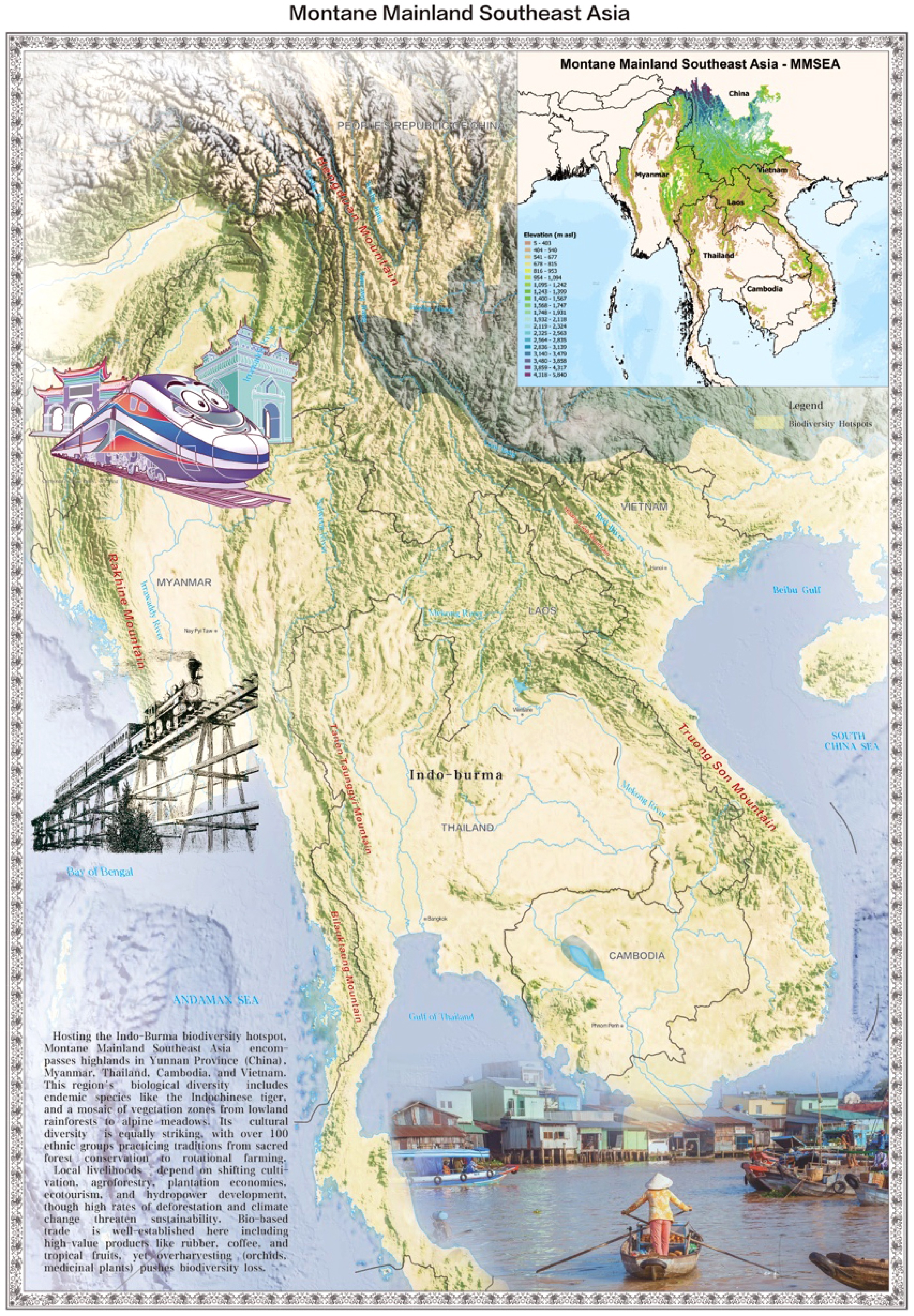 As part of the Indo-Burma biodiversity hotspot, Montane Mainland Southeast Asia encompasses highlands across China, Myanmar, Thailand, Cambodia, and Vietnam (Fig. 2). This region's biological diversity includes elephants, tigers, and a complex mosaic of vegetation from lowland rainforests to alpine scrub[20]. Cultural diversity here is also striking, with over 100 ethnic groups practicing land-use including sacred forest conservation, shifting cultivation, and monoculture plantations. High-value, bio-based crops are well-established here, including rubber, coffee, and tropical fruits, yet high rates of deforestation and climate change threaten sustainability[21].