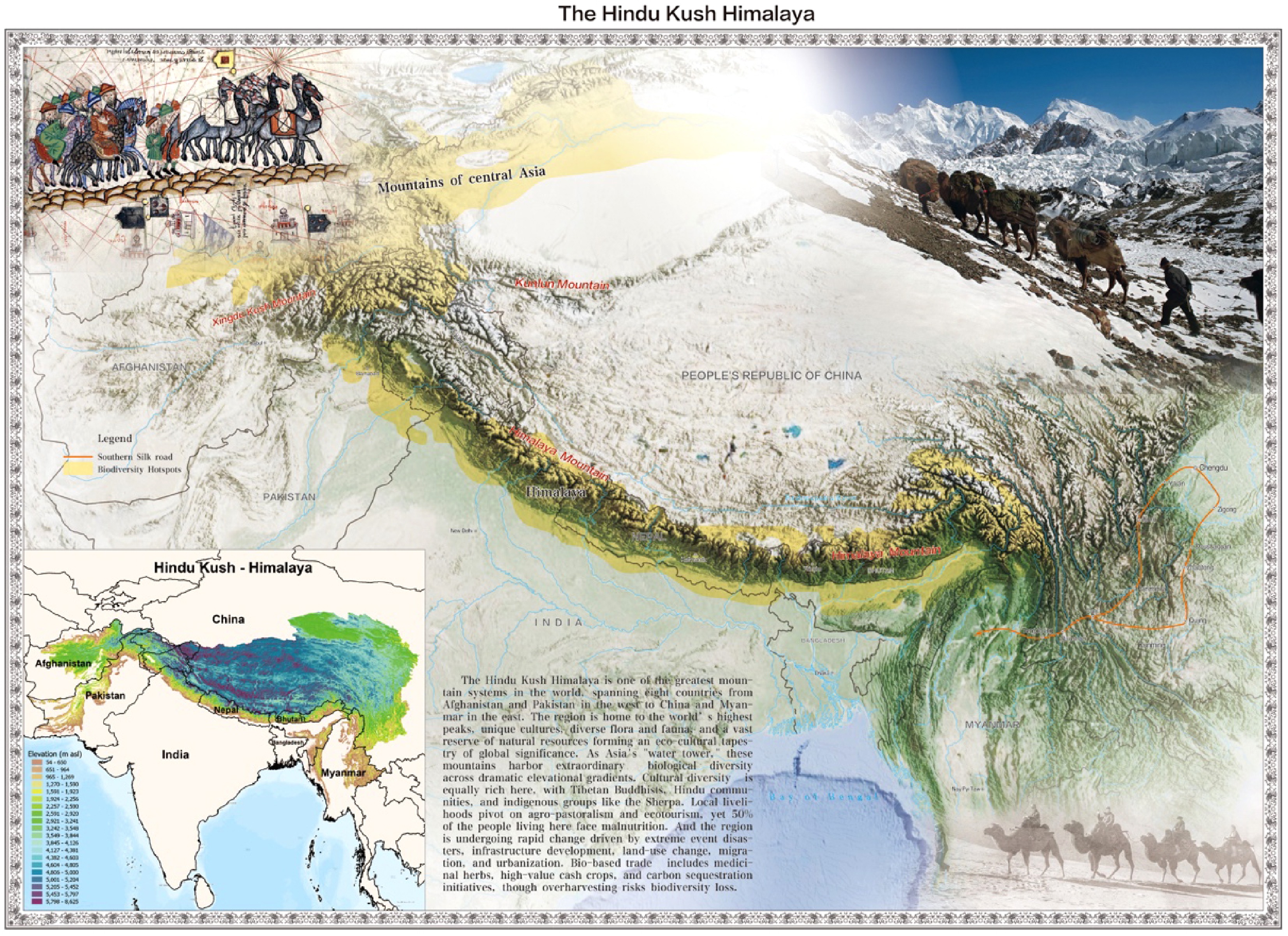 Across eight countries, the Hindu Kush Himalaya (Fig. 3) is home to the world's highest peaks, diverse flora and fauna, and rich natural resources, including Asia's 'water tower'[22]. Cultural diversity is equally rich here, with local livelihoods pivoting on agro-pastoralism, ecotourism, and a developing bio-based trade in herbs and cash crops. Yet the region is undergoing rapid change driven by extreme events, infrastructure development, land-use change, urbanization, and climate impacts[23].