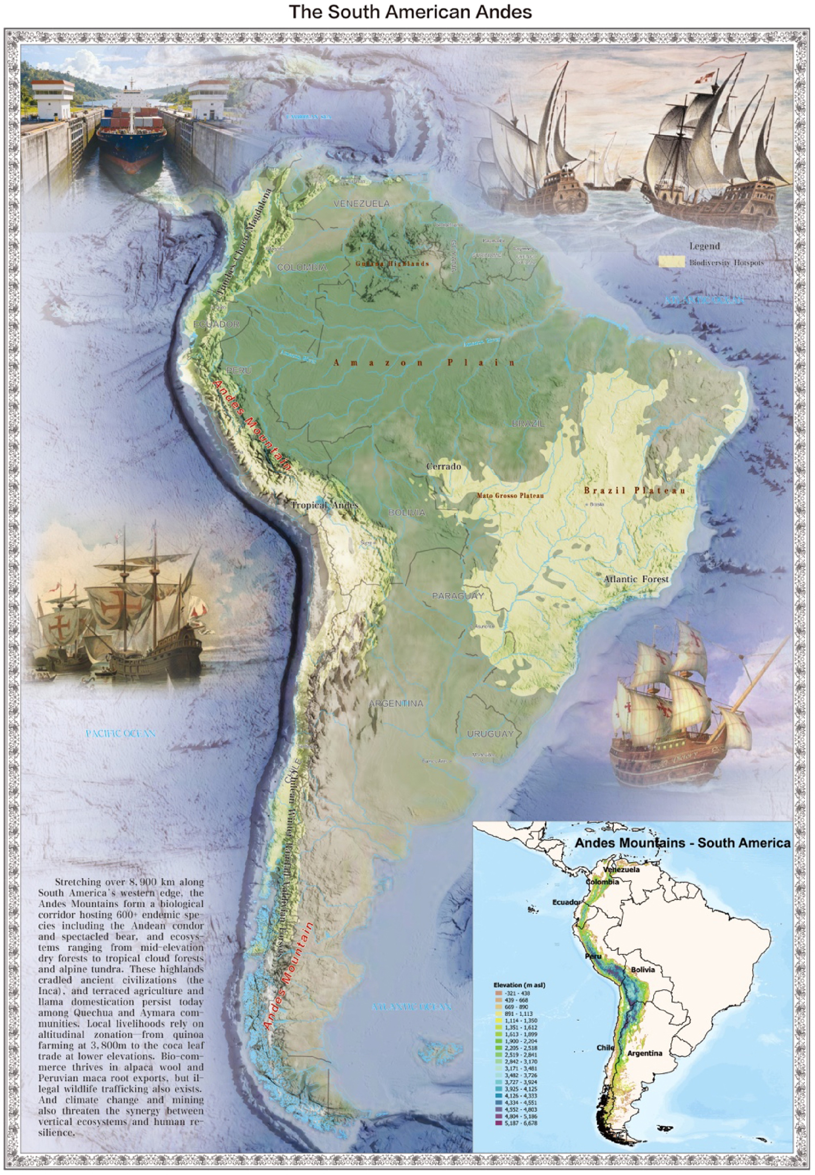 Stretching over 8,900 km along South America's western edge, the Andes (Fig. 5) form a north-south biological corridor hosting many hundreds of endemic plants and animals along with ecosystems ranging from mid-elevation dry forests to alpine tundra[26]. These highlands cradled ancient civilizations, and terraced agriculture and llama domestication continue today in many indigenous communities. Bio-commerce thrives in alpaca wool and maca root exports, but rapid climate change, wildlife trafficking, and mining threaten both mountain ecosystems and human resilience[27].