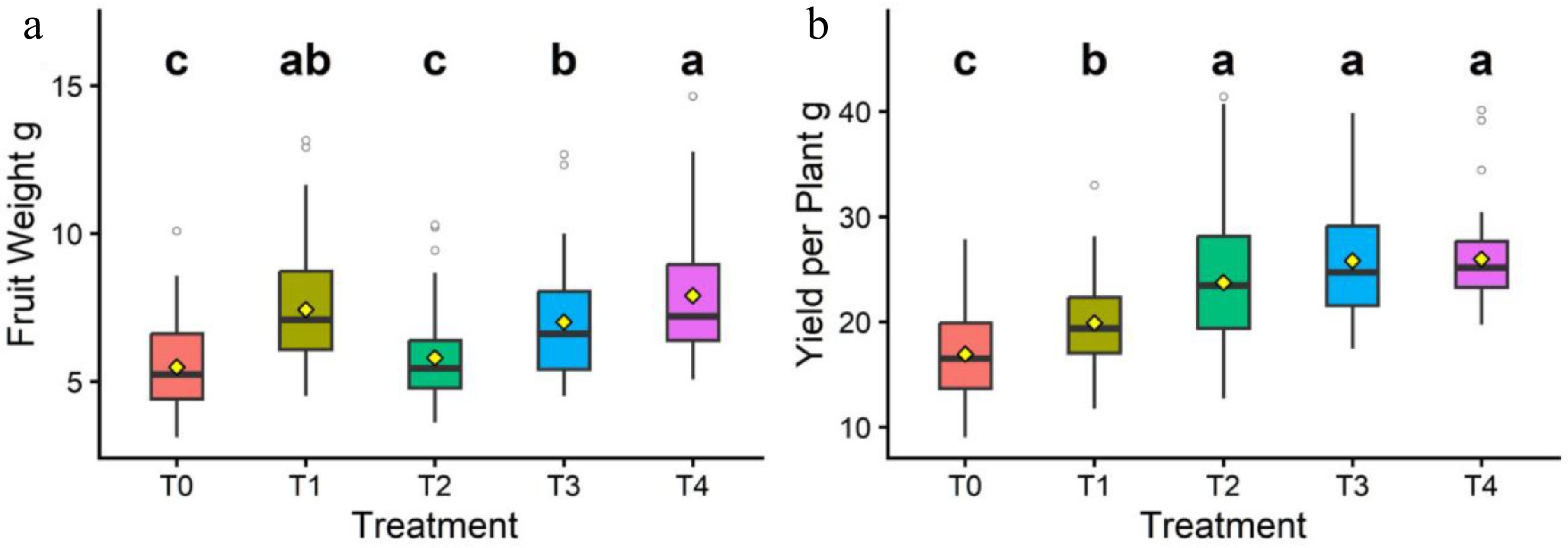 Crop yield as influenced by wood vinegar and inorganic fertiliz. The panel shows fruit weight (a) and yield per plant (b). Different lowercase letters indicate significant differences among treatments. T0: Negative control; T1: WV; T2: RRF (90–0–60 kg NPK); T3: WV + RRF (45–0–30 kg NPK); T4: WV + RRF (135–0–90 kg NPK).