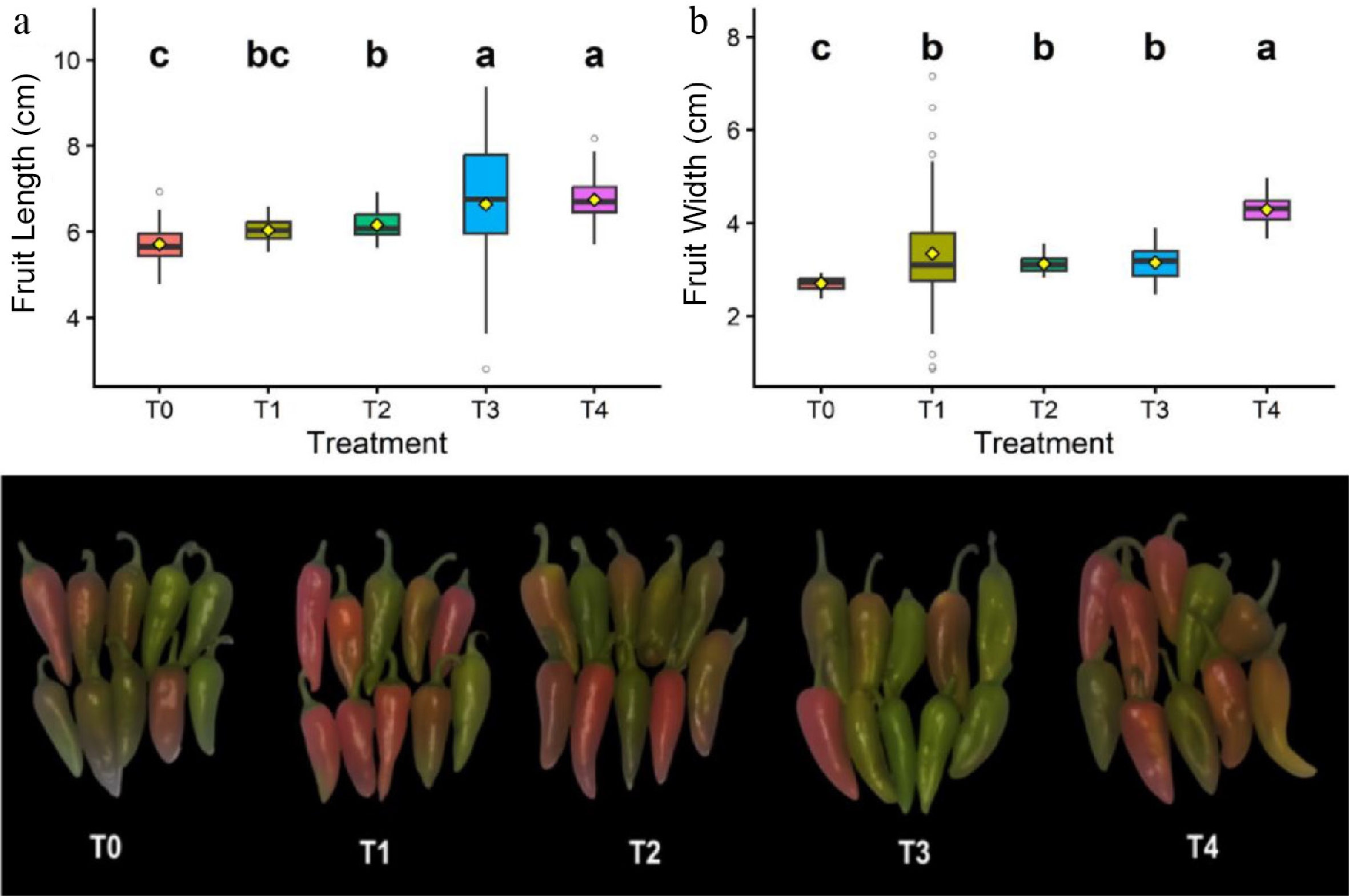 Effect of different treatments on (a) fruit length, (b) fruit width of bell pepper. Different lowercase letters indicate significant differences among treatments. T0: Negative control; T1: WV; T2: RRF (90–0–60 kg NPK); T3: WV + RRF (45–0–30 kg NPK); T4: WV + RRF (135–0–90 kg NPK).