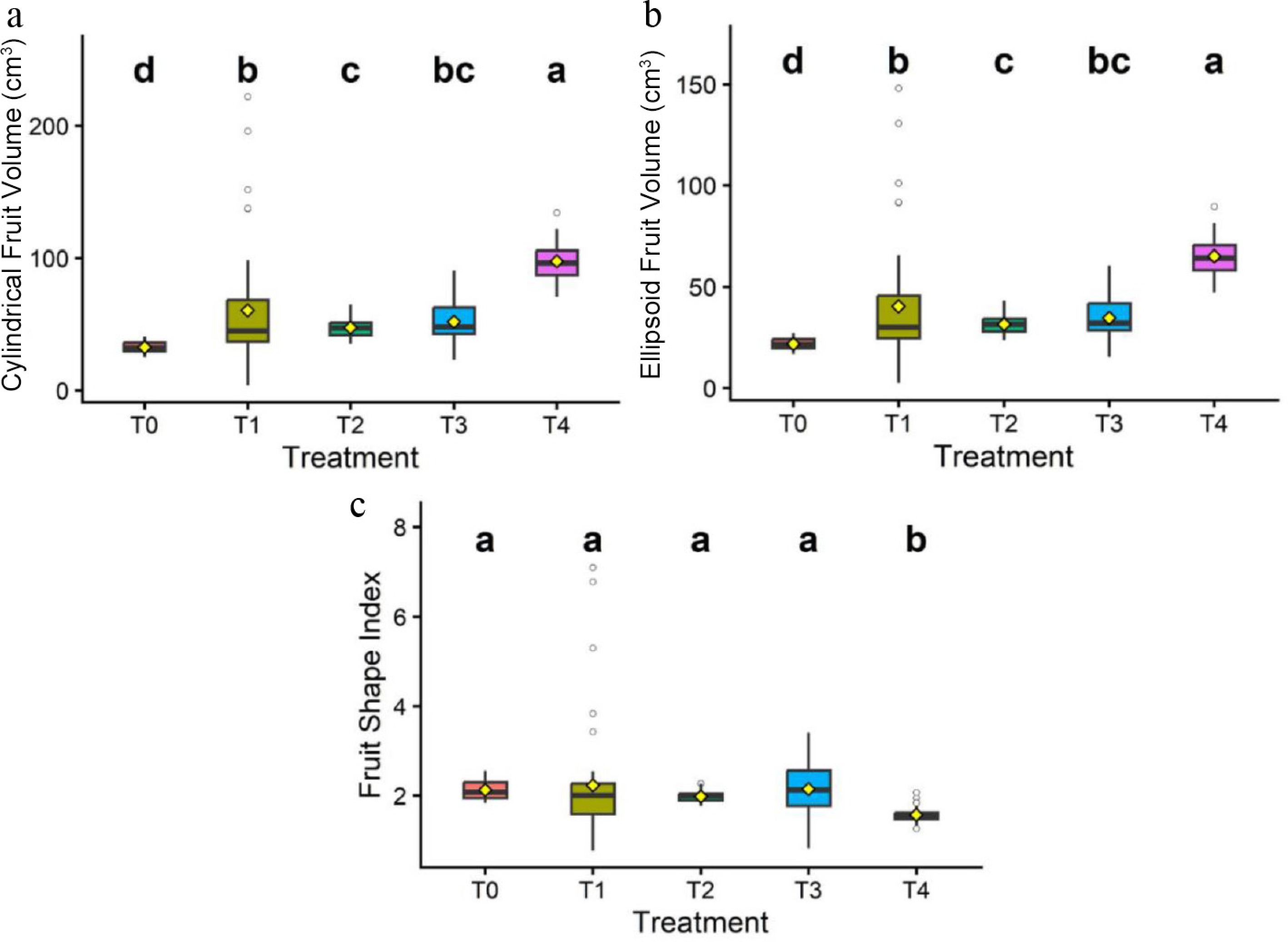 Fruit morphology of bell pepper as influenced by different treatments. Panels represent (a) cylindrical fruit volume, (b) ellipsoid fruit volume, and (c) fruit shape index. Different lowercase letters indicate significant differences among treatments. T0: Negative control; T1: WV; T2: RRF (90–0–60 kg NPK); T3: WV + RRF (45–0–30 kg NPK); T4: WV + RRF (135–0–90 kg NPK).