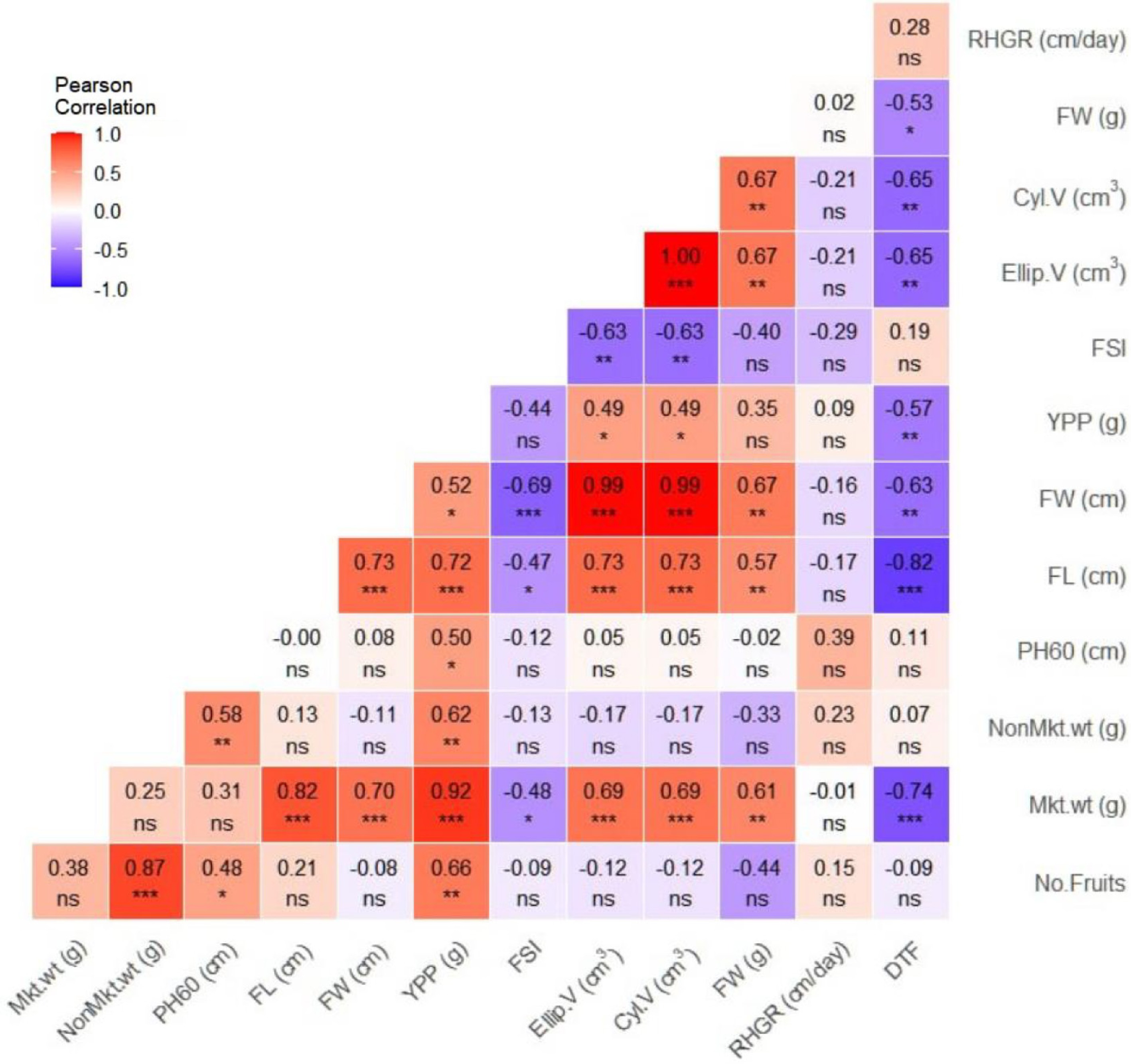Pearson correlation analysis of selected growth and yield parameters in bell pepper. PH60: plant height; RHGR: relative growth rate; DTF: days to flowering; No. Fruits: number of fruits; Mkt. wt: marketable weight; Non Mkt.wt: non-marketable weight; YYP ;plant yield; FL :fruit length; FW: fruit width; Elli.V: ellipsoid fruit volume; Cyl. V: cylindrical fruit volume; FSI: fruit shape index.