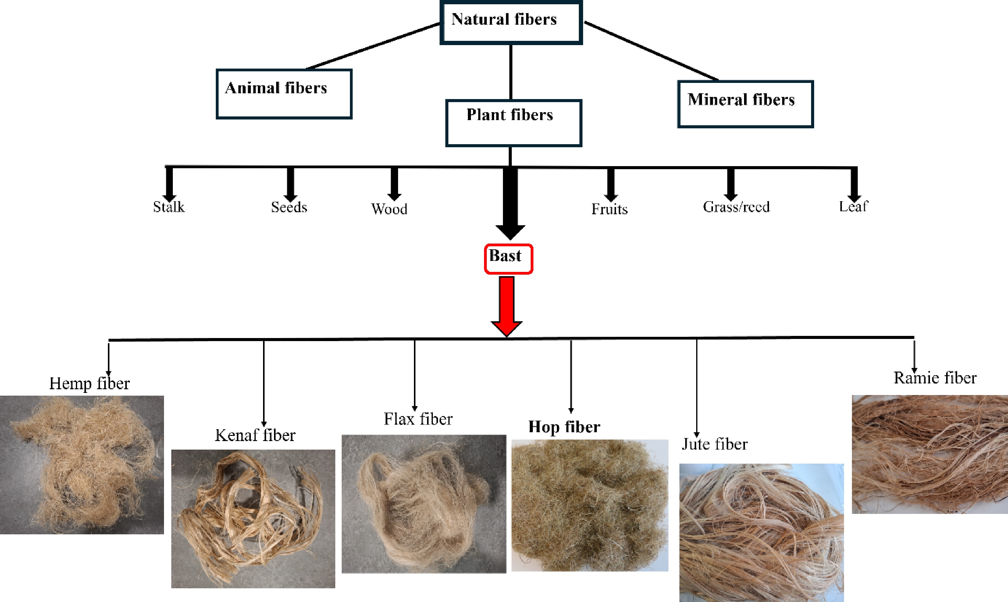 • The demand for natural fibers is increasing steadily as researchers discover their significance as sustainable and viable materials for innovative applications[1]. Usually, the fibers extracted from plants offer several advantages over synthetic fibers, such as eco-friendliness[2], lightweight[3], sustainability[4], and reusability[5]. The growing emphasis on sustainable practices has intensified the exploration of various plant sources for natural fibers, including the often-overlooked agricultural byproducts[6]. Natural fibers are classified based on their botanical origin[7,8], with bast fibers derived from the phloem (inner bark) of dicotyledonous plants being a prominent category. Common sources of bast fibers, as illustrated in Fig. 1, include flax (Linum usitatissimum), hemp (Cannabis sativa), jute (Corchorus spp.), kenaf (Hibiscus cannabinus), hop (Humulus lupulus), and ramie (Boehmeria nivea). In contrast, fibers such as cotton (seed fiber), sisal (leaf fiber), and coir (fruit fiber) do not belong to the bast fiber category as they originate from different parts of the plants[7,8]. These distinctions show the diversity of natural fibers, each possessing unique characteristics and applications depending on its source. Bast fibers are valuable for their abundance, morphology, and strength[5], making them suitable for textiles, composites, and other industrial applications[9,10].