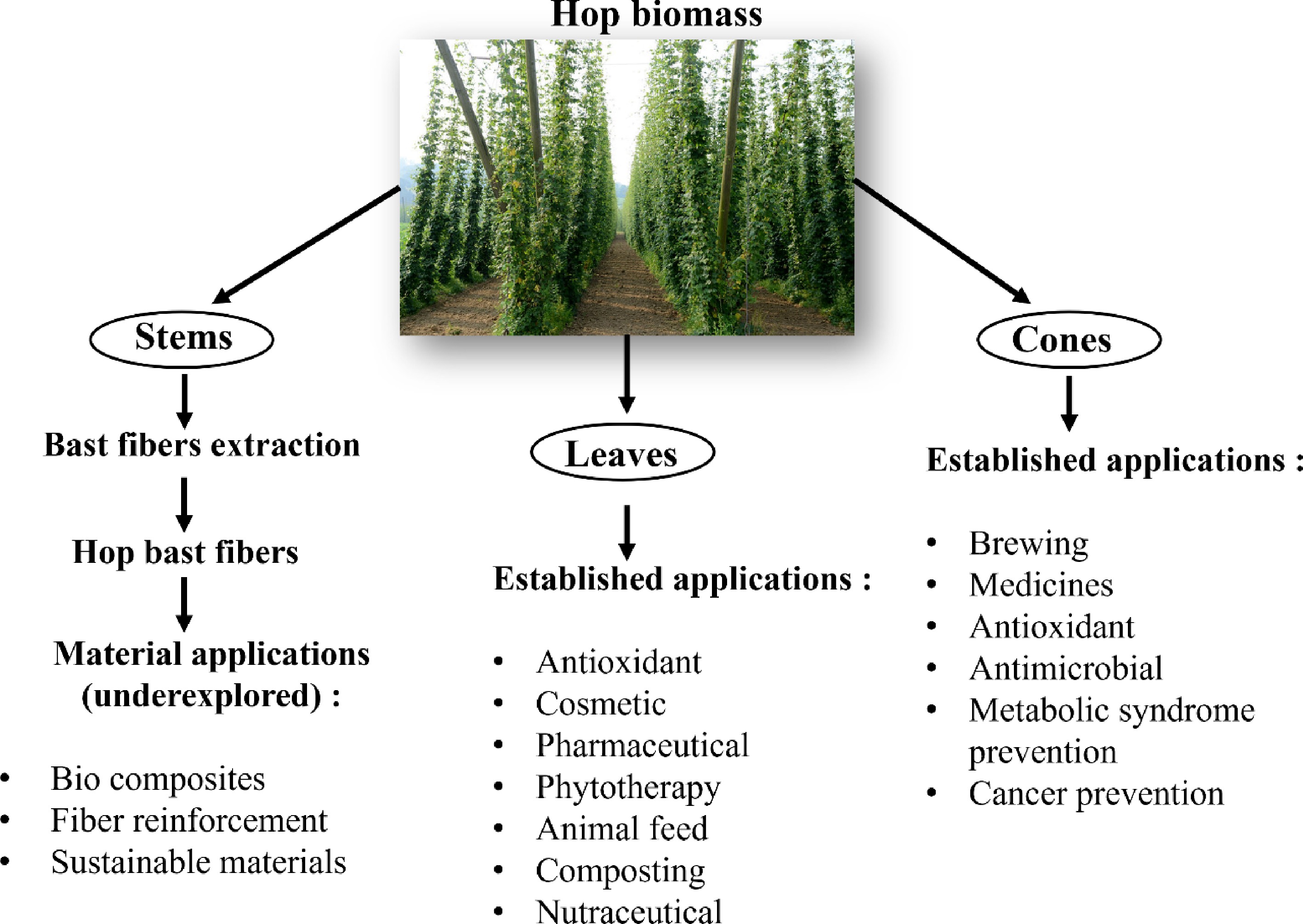 The hop plant (Humulus lupulus) is traditionally cultivated for its cones, which are essential to the brewing industry and other applications illustrated in Fig. 2[19,20].
