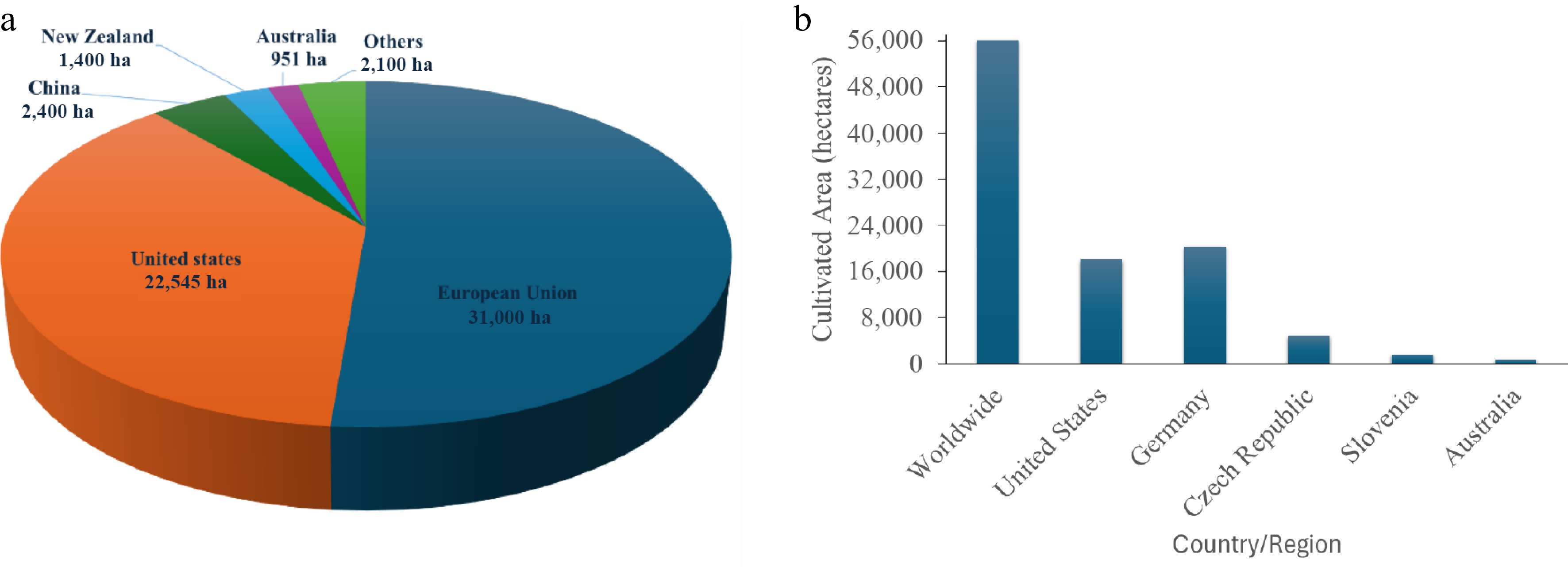 Hop plants thrive very well in temperate zones, particularly in Central Europe, where nitrogen-rich and humid environments favor their growth, and can reach heights of up to 10 m[21,22]. These plants are commonly recognized as climbing perennials, characterized by rhizomes and a peak growing period from June to September. According to the Barth Haas report, Fig. 3a[23,24], Europe led global hop production in 2023, with a hop cultivated area of 3,100 hectares (ha). With 22,545 ha, the United States ranked second, followed by China, which ranked third with 2,400 ha. Other notable hop-producing regions include New Zealand (1,400 ha), Australia (951 ha), and others (2,100 ha). In 2024, global hop producers harvested approximately 113,528 metric tons of hops across 55,715 ha, benefiting from improved per-hectare yield efficiency (averaging ~2.04 t/ha) and strong performance across major growing regions[25]. As shown in Fig. 3b, Germany had the largest cultivated area with 20,289 ha, followed by the United States with 18,026 ha. The Czech Republic maintained 4,852 ha of cultivation, preserving its status as a significant European hop-grower. Slovenia supported global output with around 1,641 ha dedicated to hop production. In the southern Hemisphere, Australia achieved substantial results, cultivating 670 ha[25]. Together, Germany and the United States supplied around 76% of total output, with Germany alone contribution 41%, marking a notable leadership position in world hop production. Beyond these two leading nations, several other countries made meaningful contributions to the global supply. Veritable balance in the 2024 harvest was well maintained: roughly 53% of the crop comprised aroma hops, with the remaining 47% classified as bitter hops, reflecting the needs of the diverse brewing industry[25].