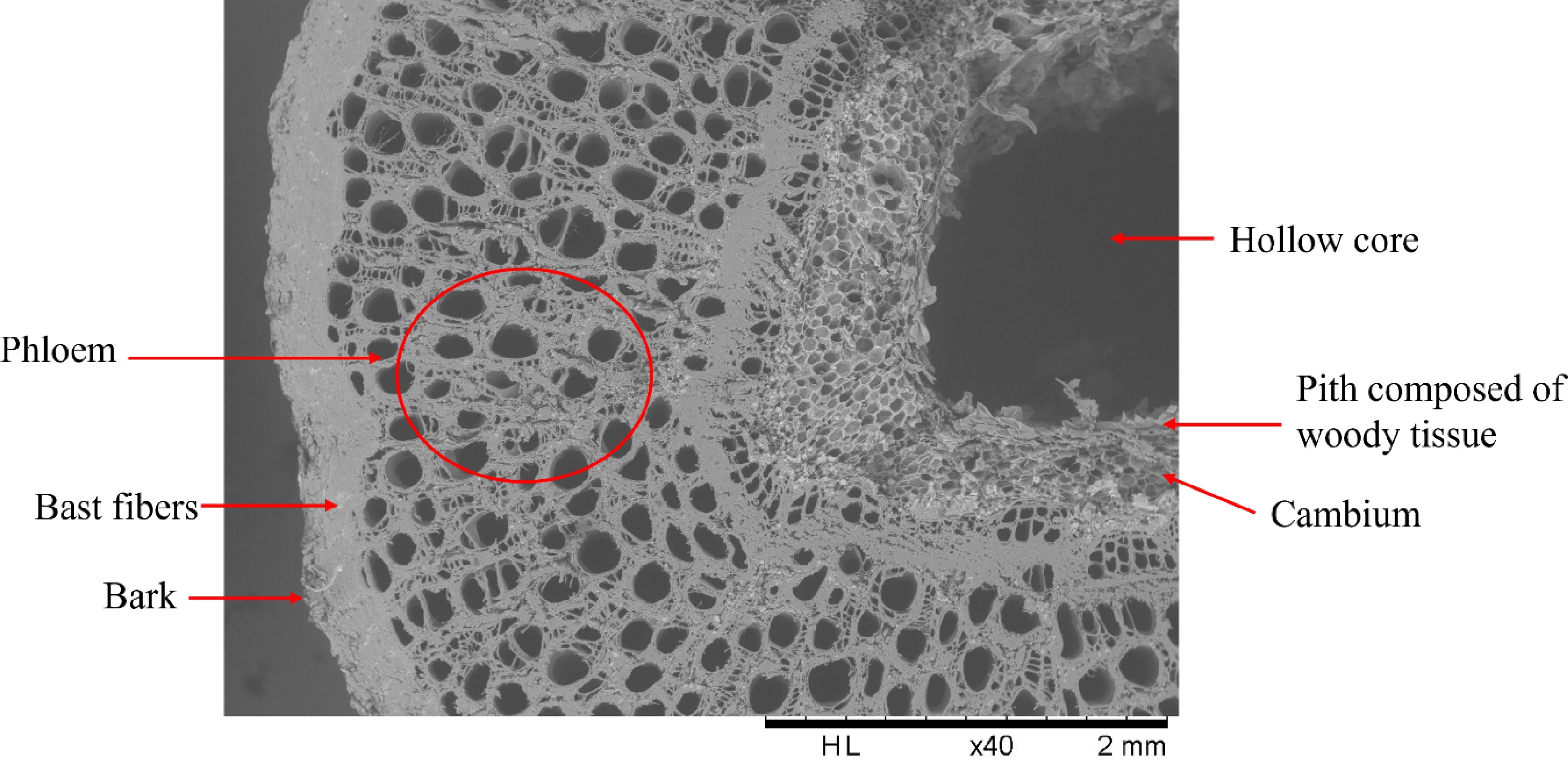 SEM image of a cross section of hop bine. Image from Lorraine University, LERMAB laboratory.
