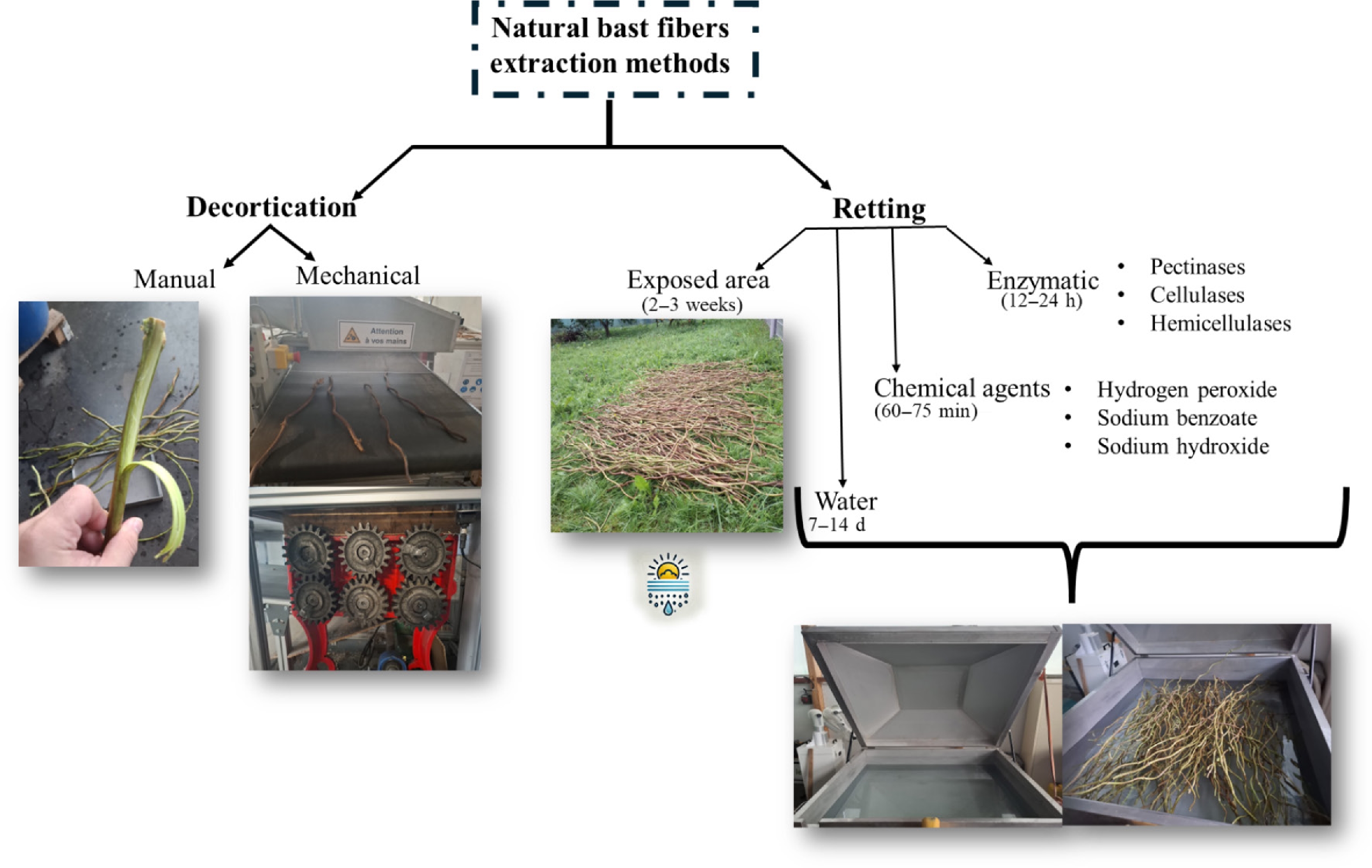 Schematic representation of the different methods for bast fibers extraction[33]. Images obtained at Lorraine University (LERMAB Laboratory. The hop biomass used in this study was sourced from the agricultural center in Obernai, Alsace.