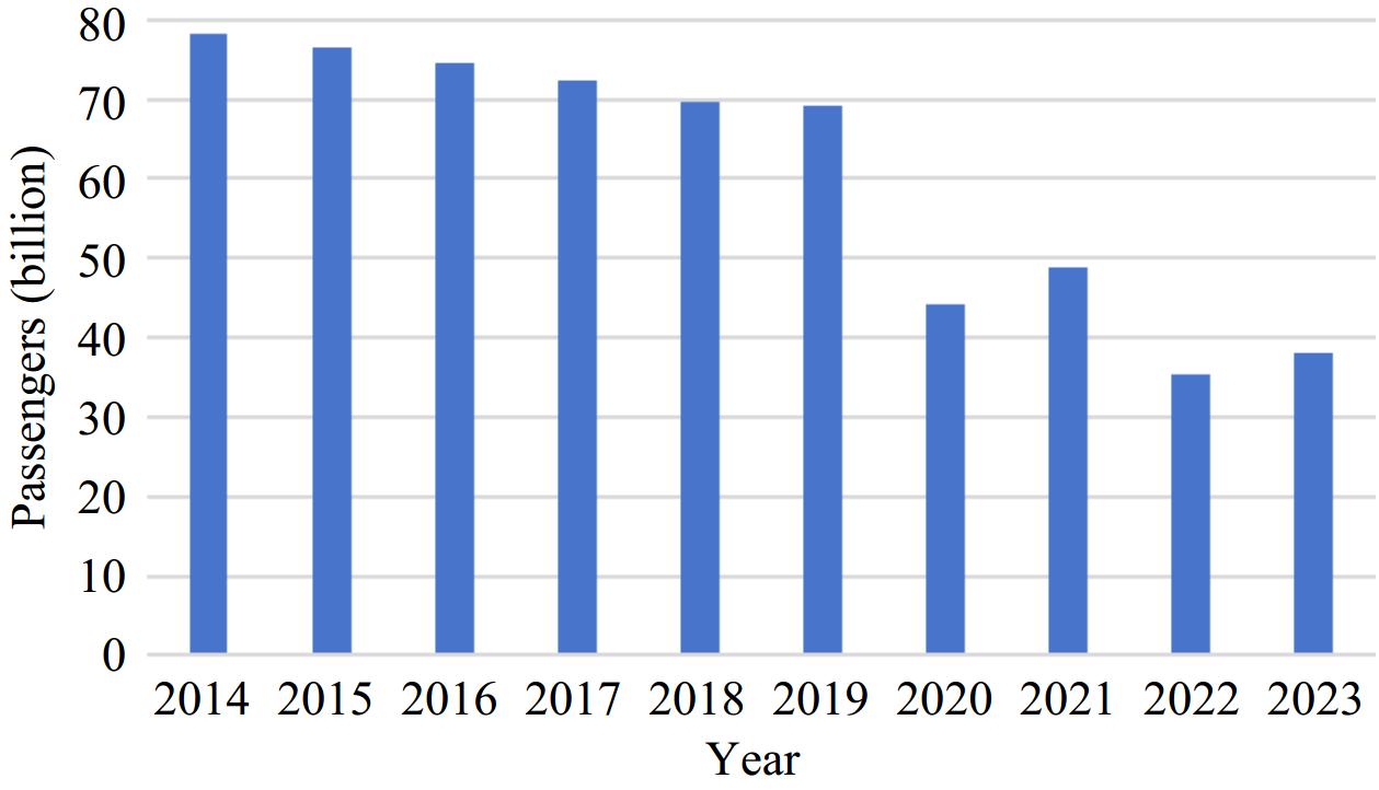 However, the development of bus systems also faces challenges. Due to financial pressures and competition from other modes of transport, the development of bus systems has been severely tested. According to information from the Ministry of Transport of China, bus system ridership in China has shown a declining trend over the past decade[2], as illustrated in Fig. 1. The ridership in 2023 was 38.050 billion passengers, a decrease of 49% compared to 74.535 billion passengers in 2014. The problem of decreasing passenger flow is also happening in the USA, Japan, the UK, and other countries. To improve competitiveness, it is crucial to optimize bus systems.