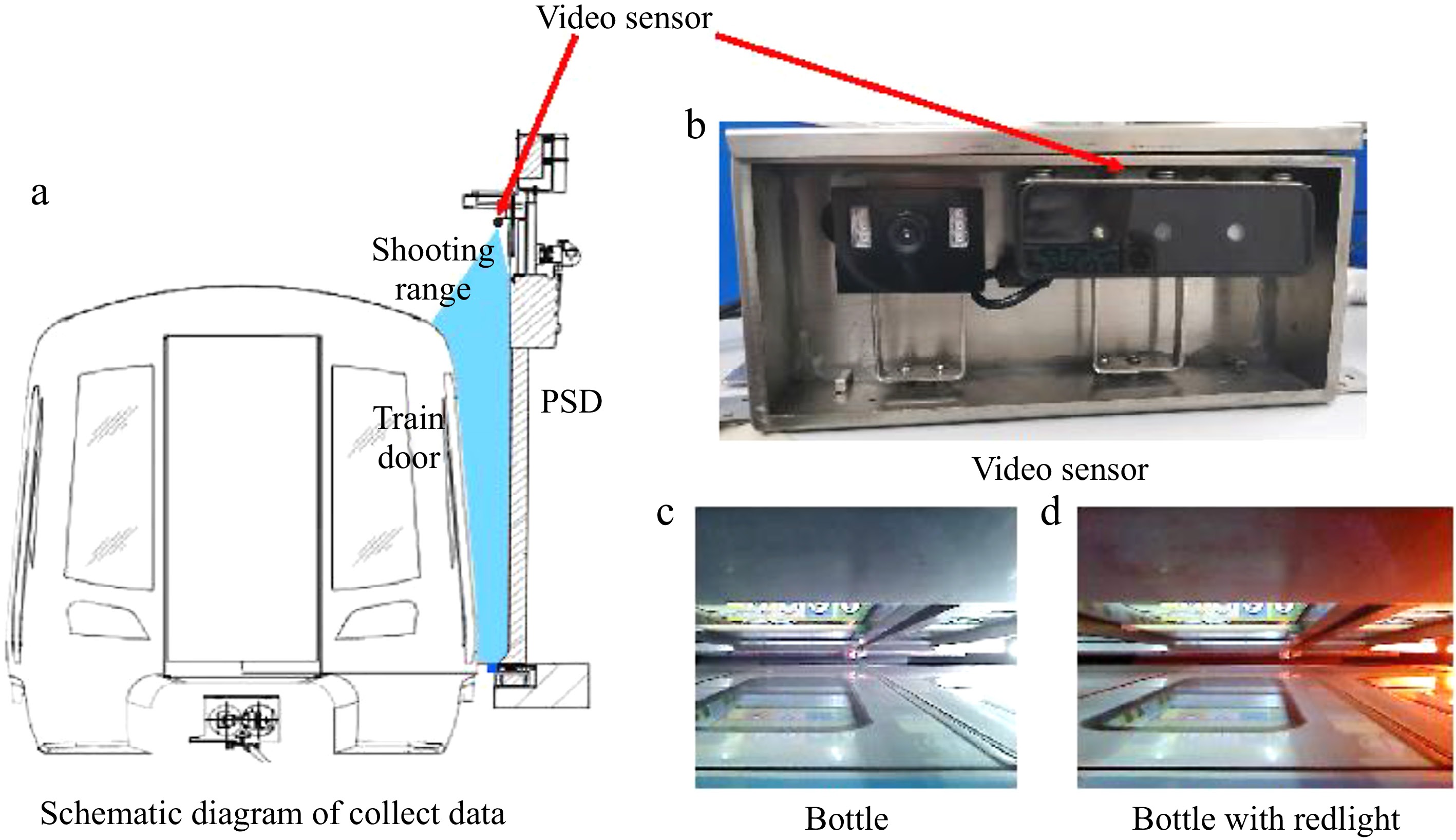 The data collection process was conducted under formal approval and strict supervision from Guangzhou Metro, with comprehensive safety protocols and privacy protection measures implemented throughout. All data collection activities were carried out exclusively during non-operational hours at metro stations. VGA cameras with a resolution of 640 × 480, mounted on metro doors as shown in Fig. 2a and b were utilized. The fixed camera positions ensured stable and clear image capture, producing high-quality data suitable for deep learning applications while minimizing operational disruption. During the collection, it was observed that external flashing red lights affected certain PSDs, resulting in two distinct lighting conditions for some doors, as illustrated in Fig. 2c and d. This natural variation in lighting conditions enhances the dataset's robustness for real-world applications. Throughout the entire process, from data collection to processing and storage, strict adherence to privacy protection protocols were maintained through careful scheduling and data anonymization procedures, ensuring full compliance with metro operation standards and regulations.