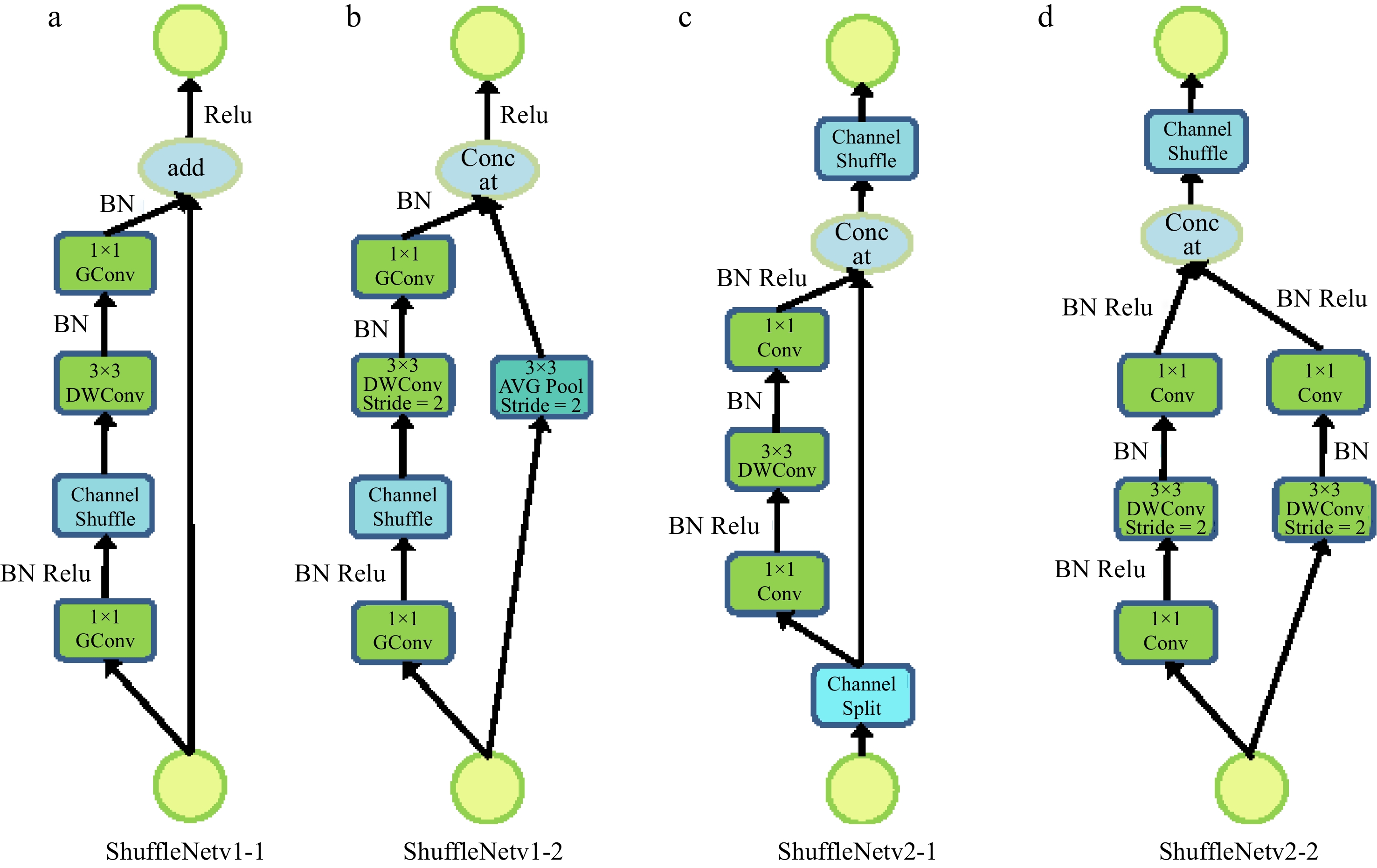 The ShuffleNet series addressed efficiency through channel shuffle operations in ShuffleNetV1, later optimized in ShuffleNetV2 with improved channel split operations and reduced memory access cost (Fig. 4). These innovations significantly improved the balance between computational efficiency and detection accuracy.