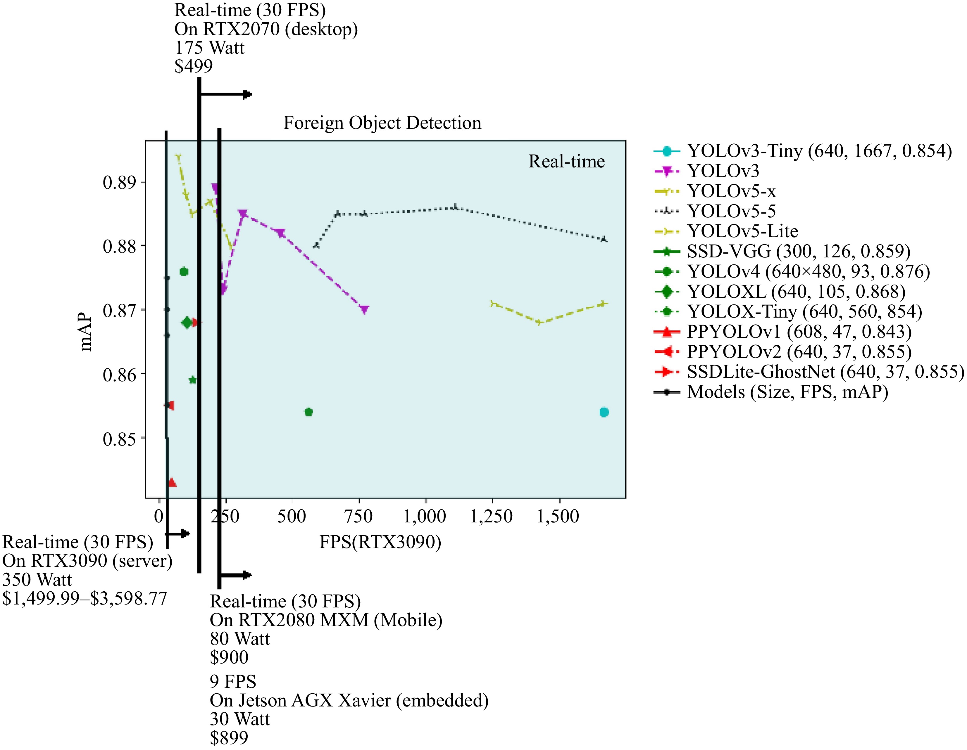To determine the most suitable model for metro deployment, 13 representative algorithms were compared (Fig. 5). Using 30 FPS as the real-time detection standard, it is noted that while most models meet this threshold on RTX 3090, practical deployment considerations necessitate the evaluation of more cost-effective hardware. Based on the TFLOPS ratio analysis, RTX 2070 is recommended for actual deployment, considering power consumption, price, and performance requirements.