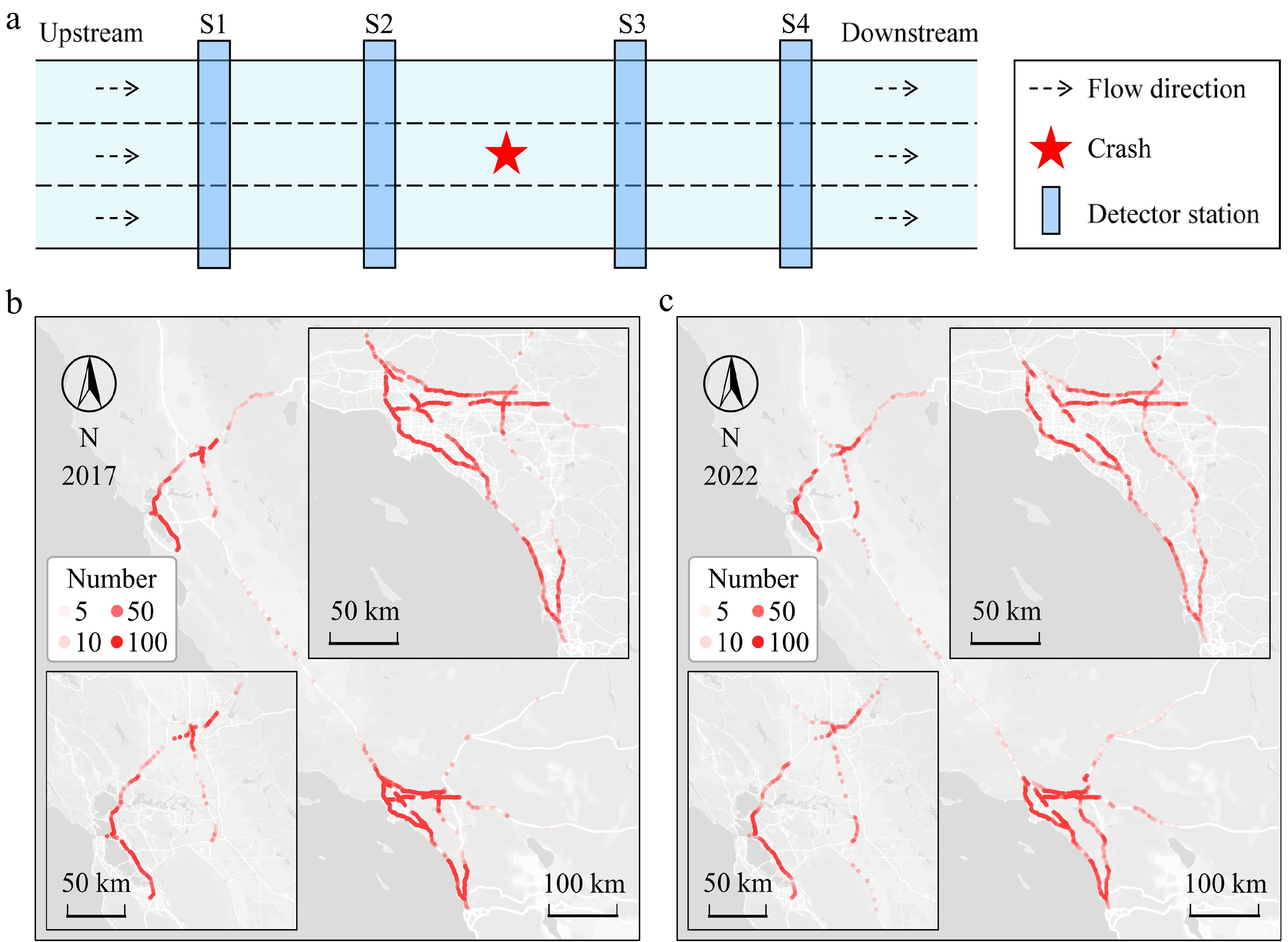 This study collected and preprocessed crash and non-crash cases with corresponding traffic data. The traffic flow and incident data were extracted from the Caltrans Performance Measurement System (PeMS), and the crash data were selected from the incident data by California Highway Patrol (CHP) codes (see Supplementary Note 1 for details). This study collected 79,192 crash cases and over 1.5 billion non-crash instances from 14 freeways between January 1, 2017, and June 30, 2017, and between January 1, 2022, and June 30, 2022, in California, USA, representing the pre- and post-COVID-19 pandemic eras, respectively. There are 6,498 mainline detector stations along the freeways, covering over 6,028 miles (see Supplementary Note 2 for details). An analysis of traffic flow operation characteristics in the chosen freeway has also been conducted (see Supplementary Note 3 for details). The results show the significant differences in traffic conditions between freeways and across years, indicating that the selected data are suitable for testing the model's spatiotemporal transferability. The data collected in 2017 was used to train the model and test spatial transferability on different freeways, and the data collected in 2022 was used to test spatiotemporal transferability.