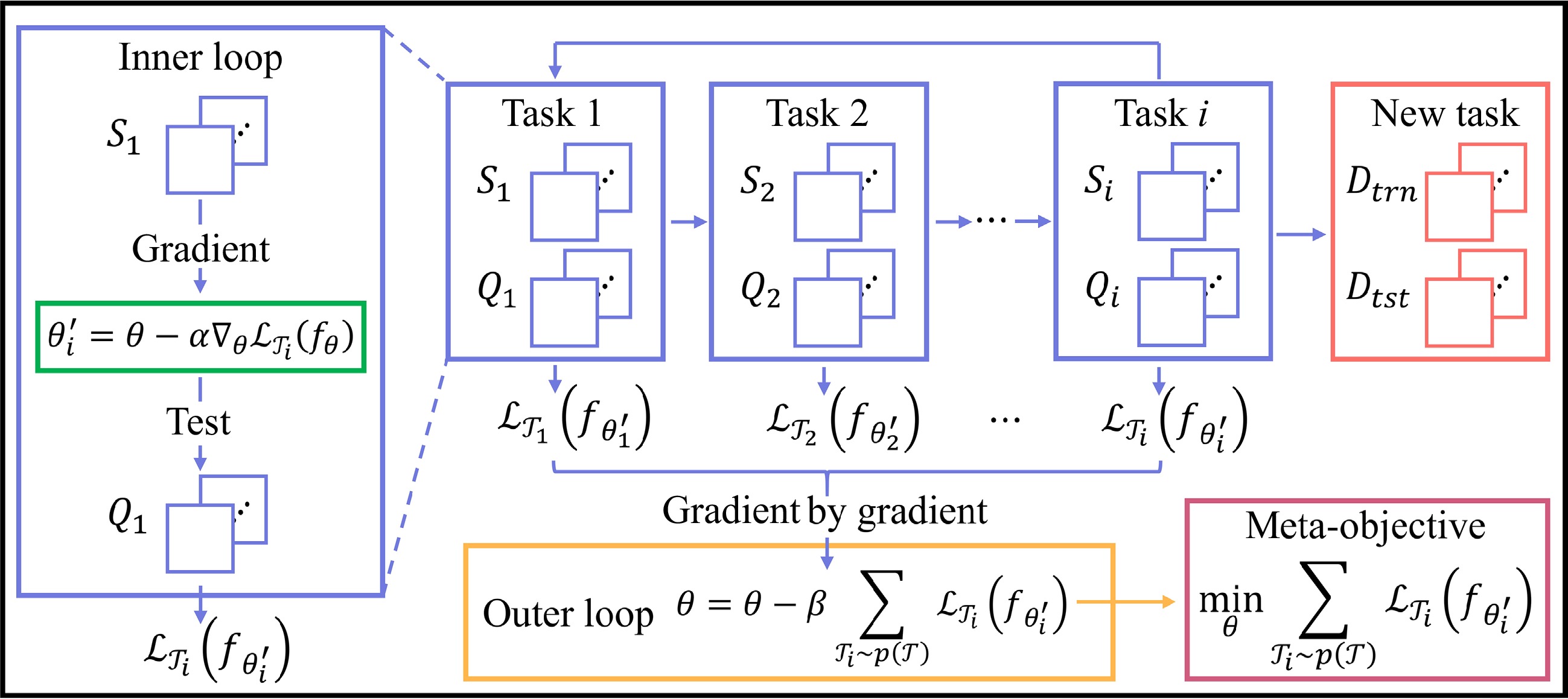 The structure of MAML is shown in Fig. 2, which consists of two nested loops. The inner loop and the outer loop share the same learner represented by a parametrized function fθ with parameter θ. Its core idea is to search for a good parameter initialization for θ in multi-task distribution