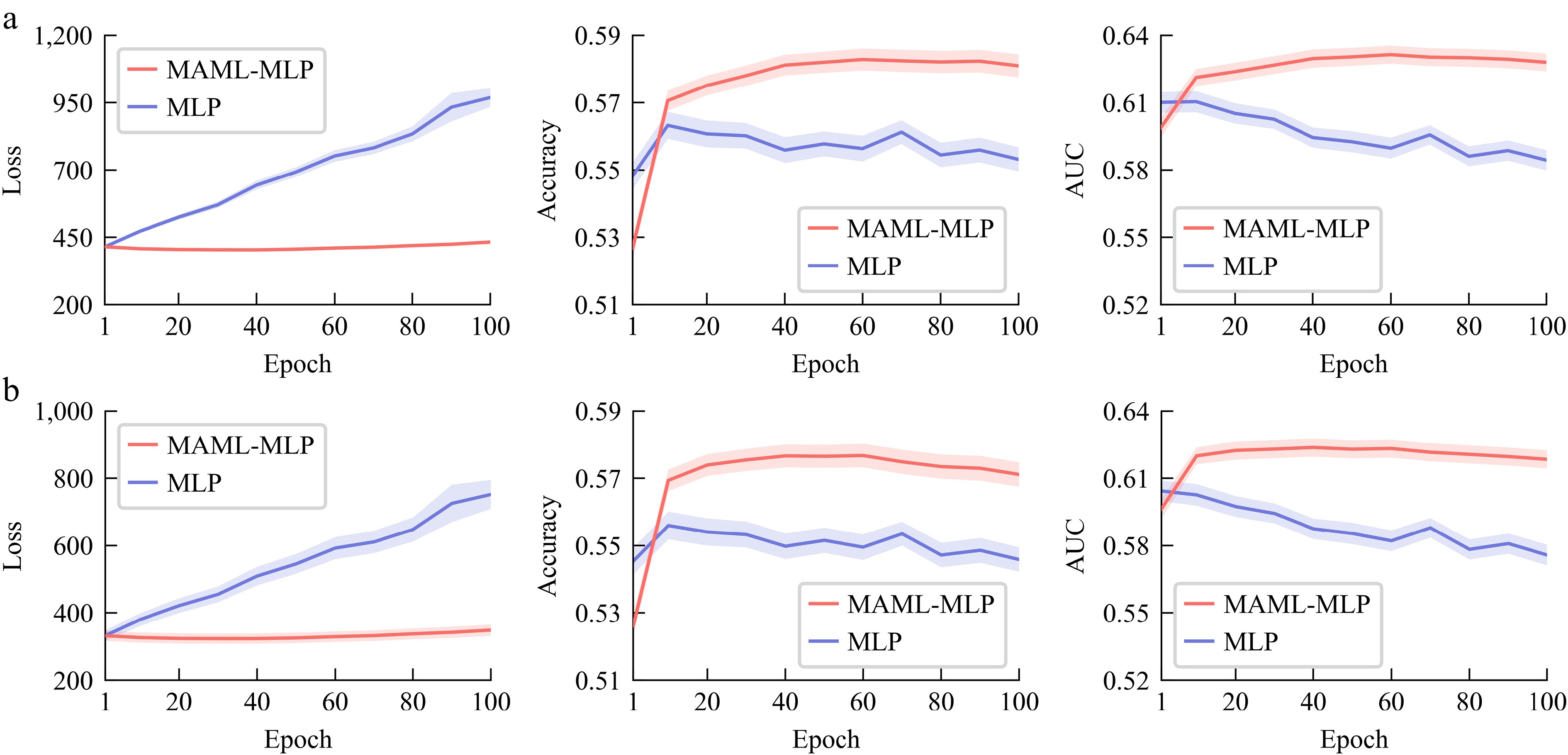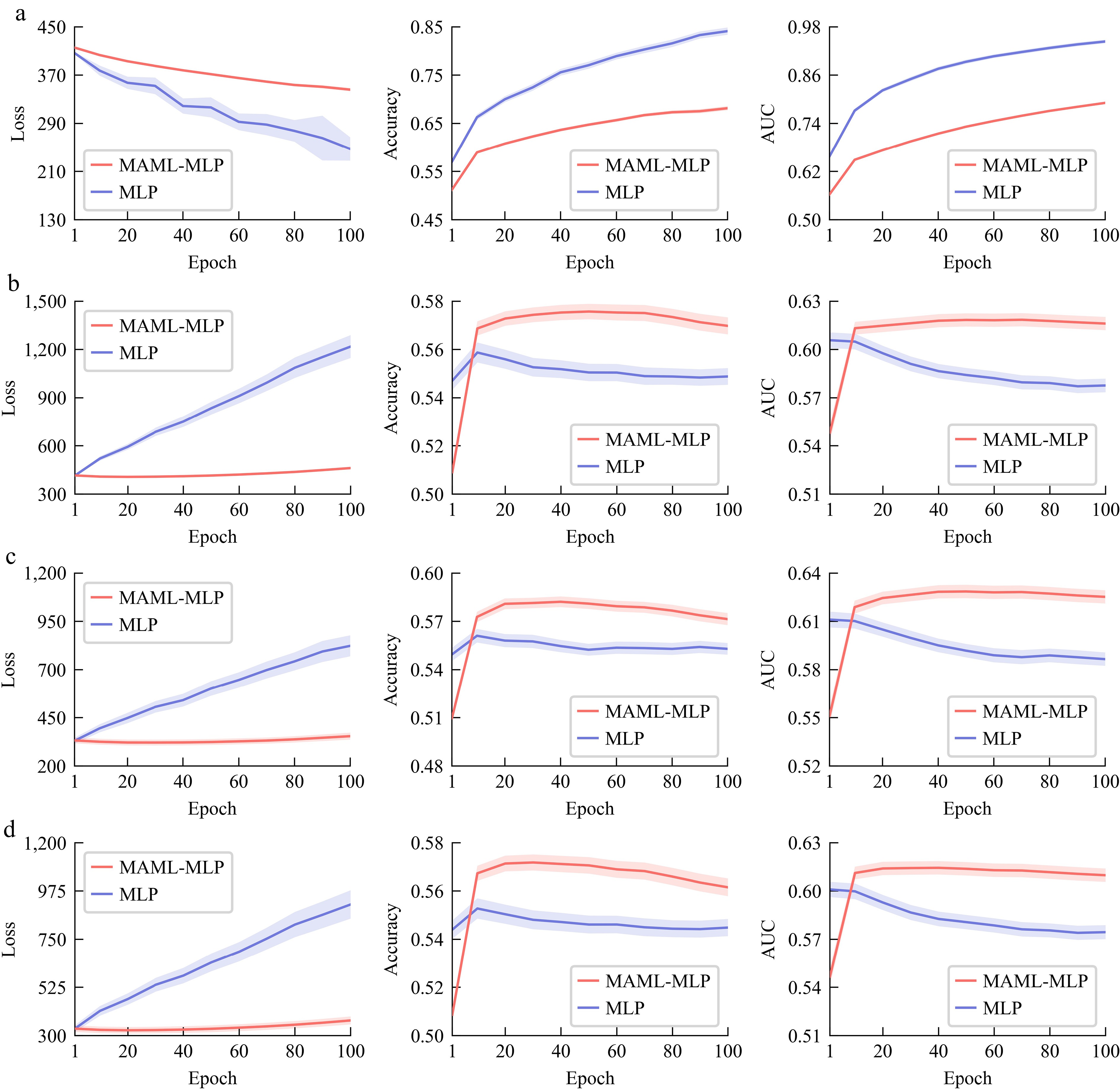 (1) Compared with Fig. 3b and d, multi-task learning has a lower loss, and higher accuracy and AUC in the inner model due to its accessibility to a broader range of data sources. MAML also shows superior improvement to single-task learning, indicating its ability to exploit commonalities and differences across tasks.