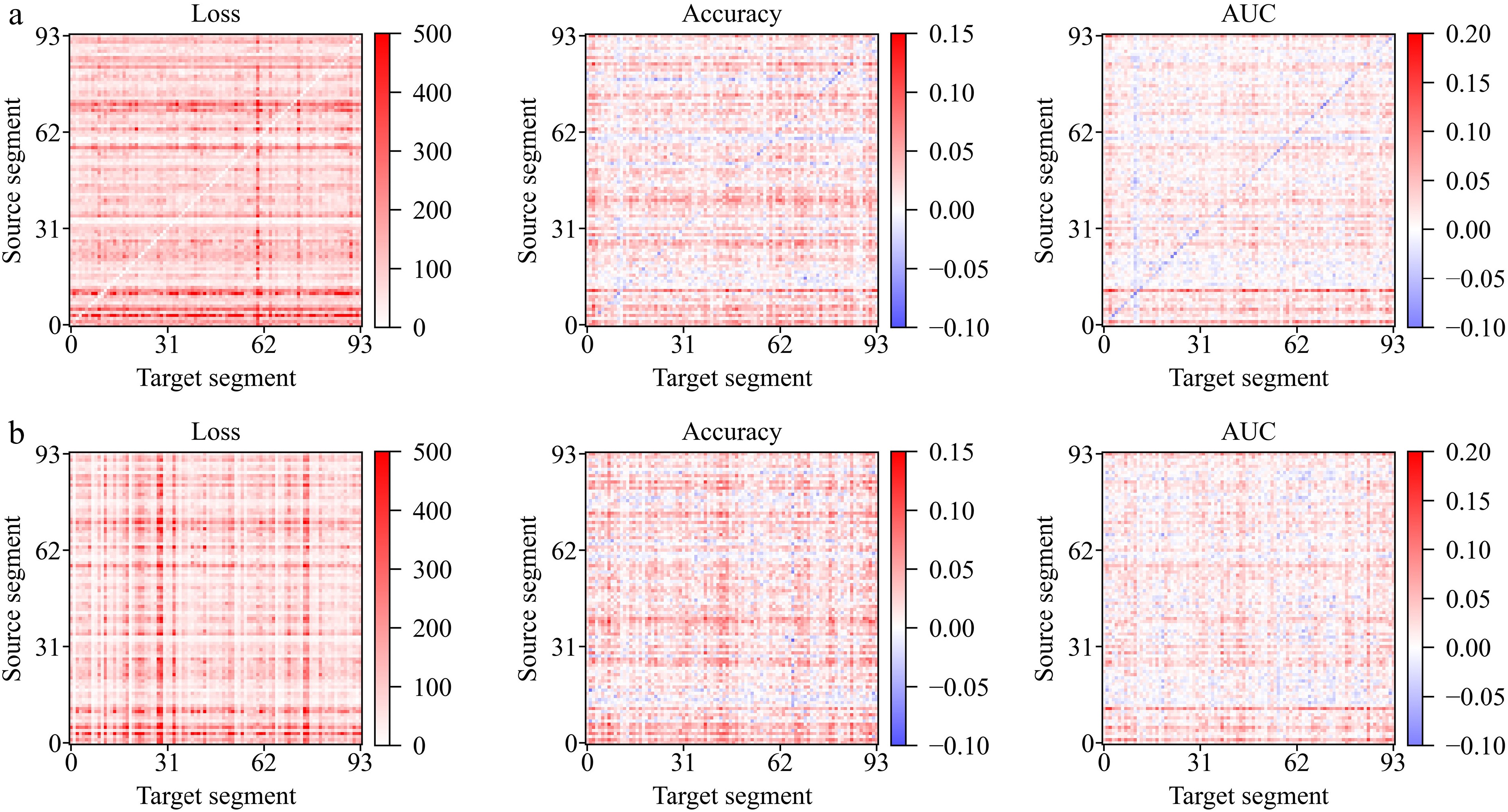 The detailed improvement is shown in Fig. 4 (the improvement value is defined as the maximum value obtained by MAML minus the maximum value obtained by MLP). Rows represent the result of the same training set with different test sets, and columns represent the result of the same test set with different training sets. MAML demonstrates improvements in loss across all tasks, and it can enhance accuracy and AUC in the majority of tasks. However, in some tasks, MAML might lead to decreased accuracy and AUC. The effectiveness of MAML is closely related to its training data, which is evident in the appearance of horizontally aligned color bands in the figure. When the inner model performs poorly, MAML tends to result in negative effects (e.g., in Fig. 4a, the accuracy of the inner model trained on segment 60 ranks last, while the improvement of MAML ranks 2nd to last. Conversely, the accuracy of the inner model trained on segment 4 ranks 4th, while the improvement of MAML ranks 3rd). The correlation between the performance of MAML and the inner model is explored in the model analysis and comparison section.