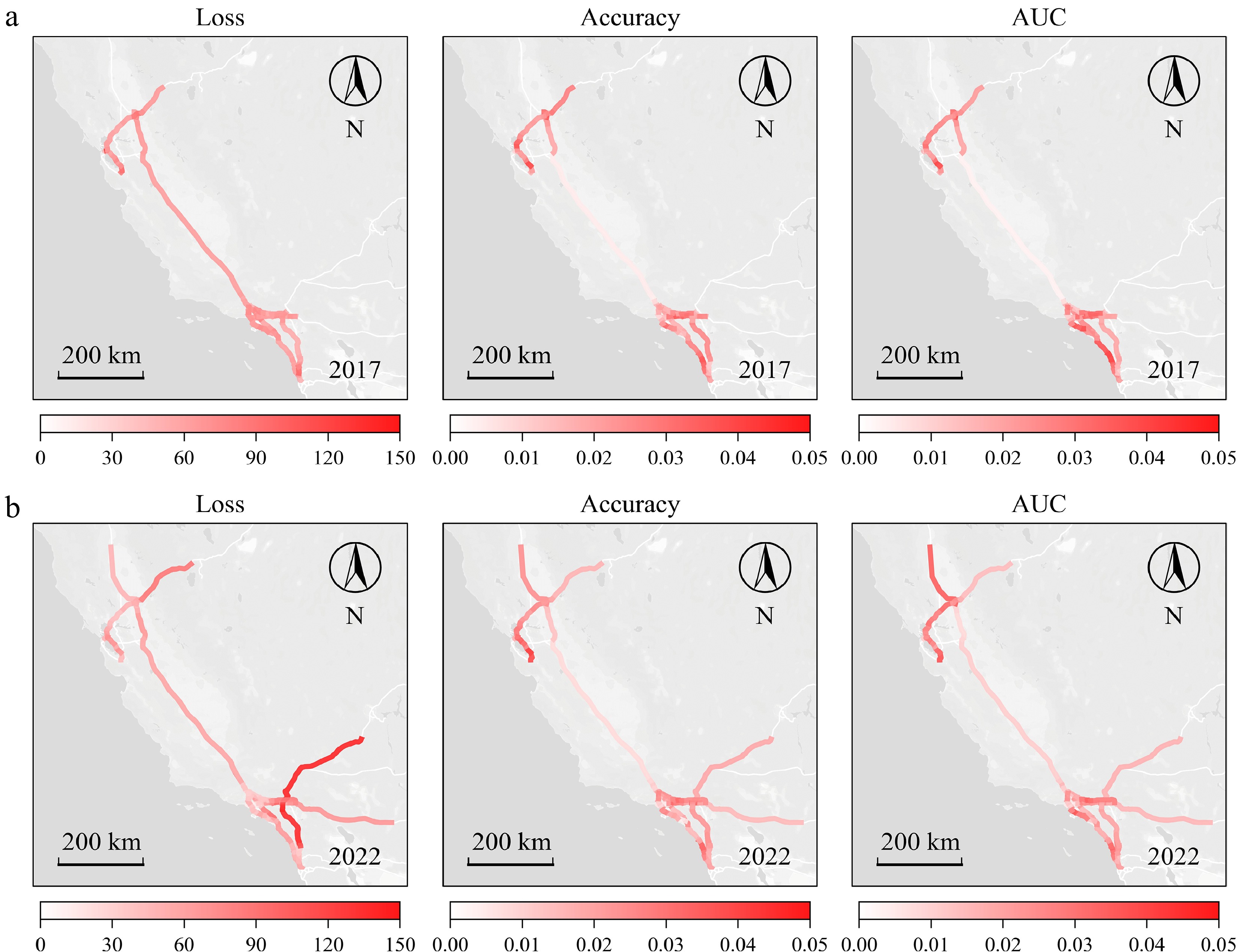 Geographical distribution of loss, accuracy, and AUC improvement. (a) Result tested on data in 2017, (b) result tested on data in 2022.