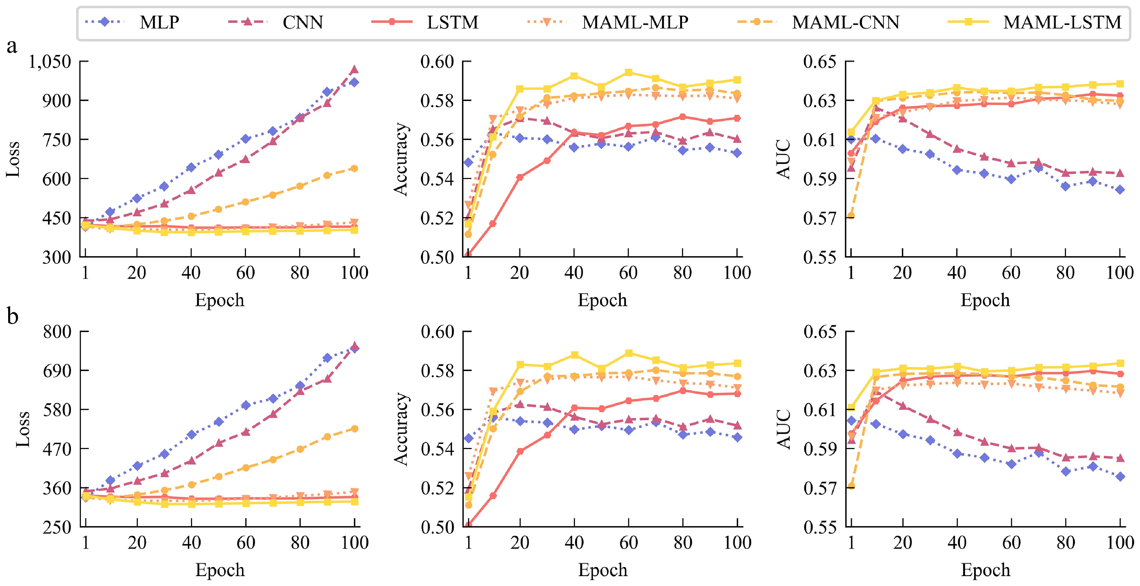 To evaluate the generalizability of MAML, two benchmark models are added to compare its performance with that of MAML. These three models are trained and tested on the same dataset as the proposed model in the multi-task learning section. Figure 8 shows the loss, accuracy, and AUC of all three models and MAML. From the model comparison, several conclusions can be drawn as follows: