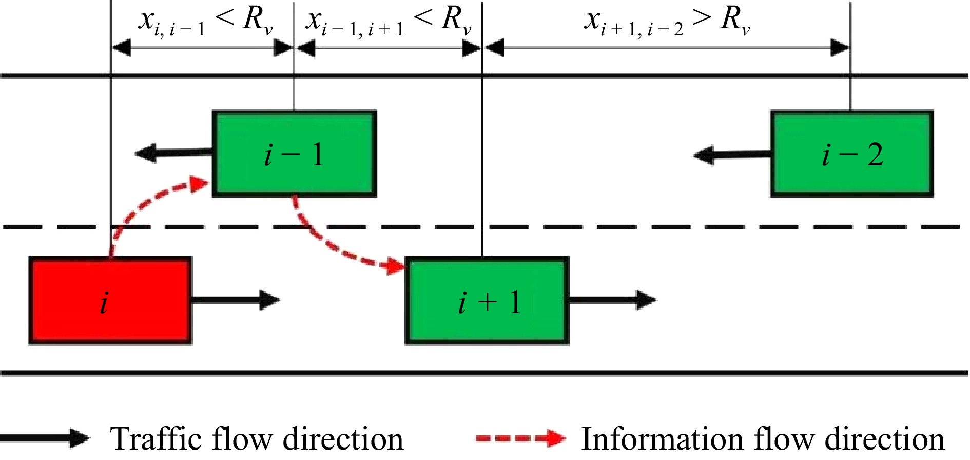 In Fig. 2, should the distance xi,i−1 between Vehicle i and Vehicle i−1, and the distance xi−1,i +1 between Vehicle i−1 and the following Vehicle i+1, both be less than the threshold Rv, the information from Vehicle i can be transferred to Vehicle i+1 in two phases, with Vehicle i−1 acting as a relay. If the separation between neighboring vehicles is greater than Rv, a relay transmission is initiated, with the vehicle transporting the information along the traffic flow until it reaches a point where the distance to the next intended vehicle is Rv. It is at this juncture that a new cycle of instantaneous transmission is initiated.