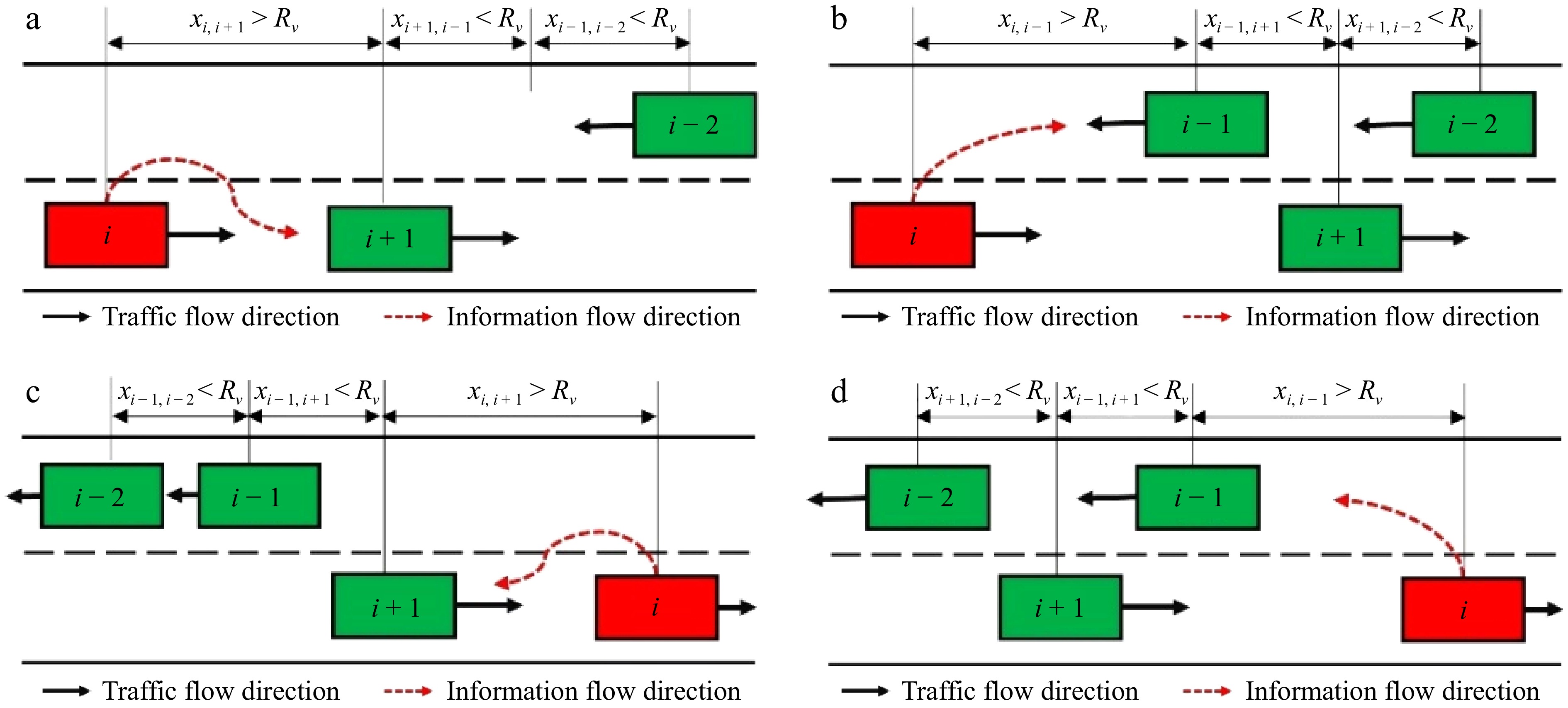 • When engaged in the relay transmission process, the data carried by the smart connected vehicles travels along the flow of traffic until the gap x reaches Rv, initiating the exchange of information at that juncture. Drawing on the principles of traffic flow-information flow interrelation, the relay transmission is categorized into four distinct modes, as illustrated in Fig. 3. Modes I and II commence from an identical starting condition, with the direction of traffic flow aligning with the direction of information dissemination, as depicted in Figs 3a and b. In Fig. 3a, the instance where Vehicle i passes Vehicle i+1 traveling in the same direction, before the approach of an oncoming Vehicle i−1, is designated as Mode I relay transmission. In Fig. 3b, the event where Vehicle i initially meets oncoming Vehicle i−1 is identified as Mode II relay transmission. In Modes III and IV, the direction of relay transmission is contrary to the direction of information flow, as depicted in Figs 3c and d. In Fig. 3c, Vehicle i, when overtaken by Vehicle i+1 moving in the same direction, exemplifies Mode III relay transmission. In Fig. 3d, as the distance between neighboring vehicles increases, Vehicle i must complete the information transfer before any meeting occurs, thereby switching to Mode II relay transmission.