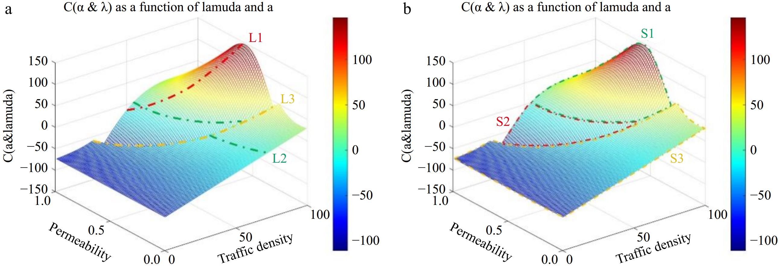 • In this segment, MATLAB is employed to render the model's visualization, as depicted in Fig. 5a, where curve L1 represents the function's peak trajectory. As traffic congestion on the highway increases progressively, the summit curve nears the surface linked to an infiltration rate of zero. In other words, as traffic density grows and hits its zenith, the necessary penetration rate diminishes. Curve L2 signifies the boundary path, when this curve is surpassed by a point on the surface, it signifies a positive return for the model; conversely, if the point is below the curve, it indicates a negative return. Curve L3 illustrates the formation of inter-vehicle connectivity at its onset. As the density of traffic flow escalates, the state curve, upon reaching its peak, demands a reduced penetration rate. An increase in traffic flow density thus corresponds to a decreased necessity for penetration rate, particularly at the curve's peak, as observed in Fig. 5b. It is evident from the same figure that within region S3, no vehicle-to-vehicle connectivity will emerge.