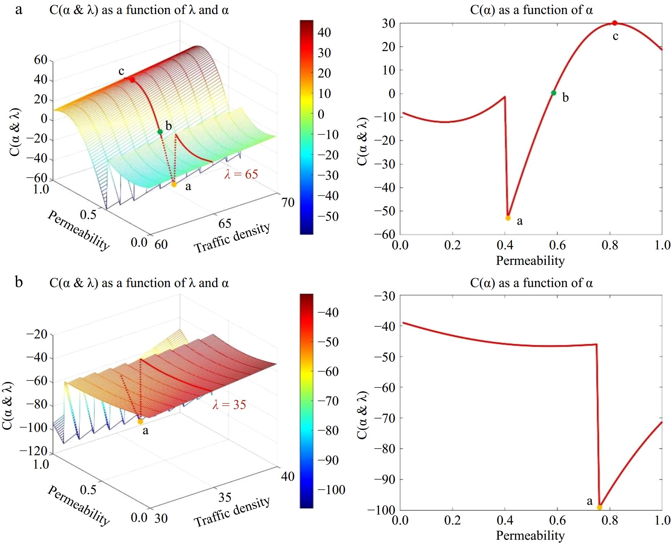 Capturing a cross-section of the model's surface at a low traffic density, as illustrated in Fig. 6b, discloses a solitary crucial node a on this curve, in contrast to Fig. 6a, and its value is negative. At this level of traffic density, irrespective of increases in the penetration rate, the model's deployment cost remains negative, suggesting that an optimal deployment interval does not exist under these circumstances.