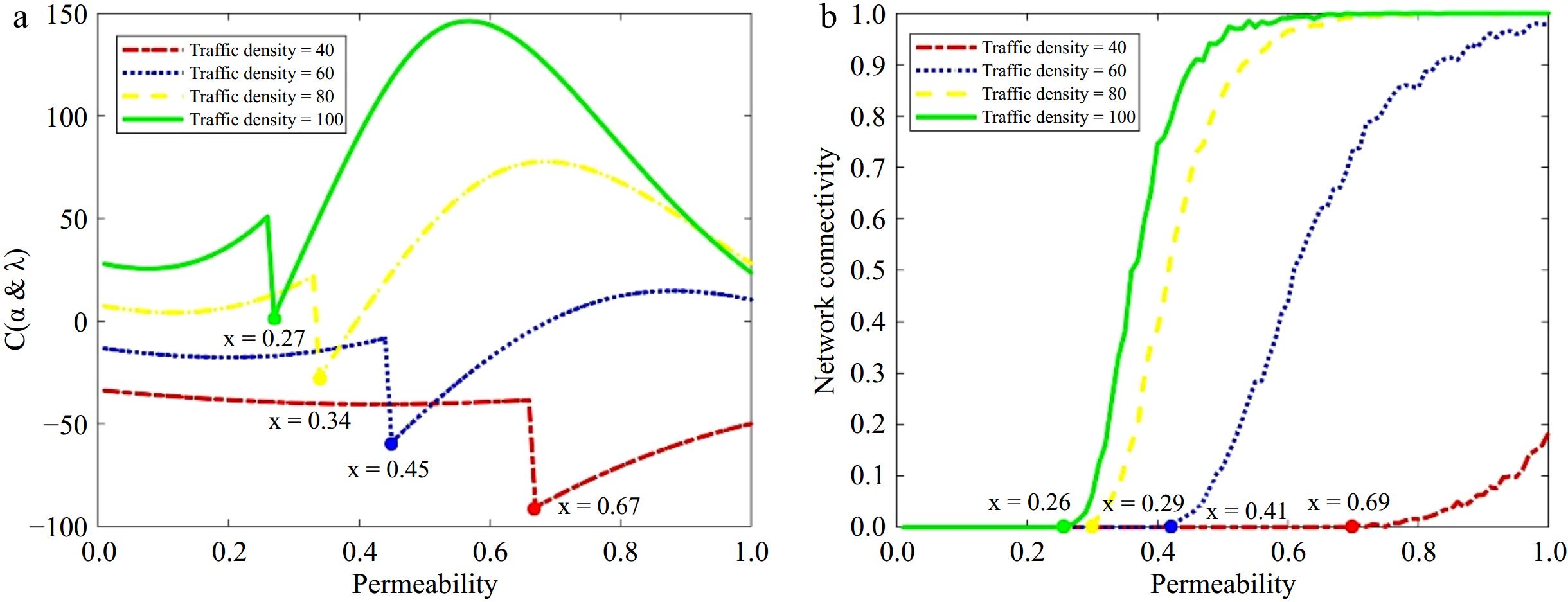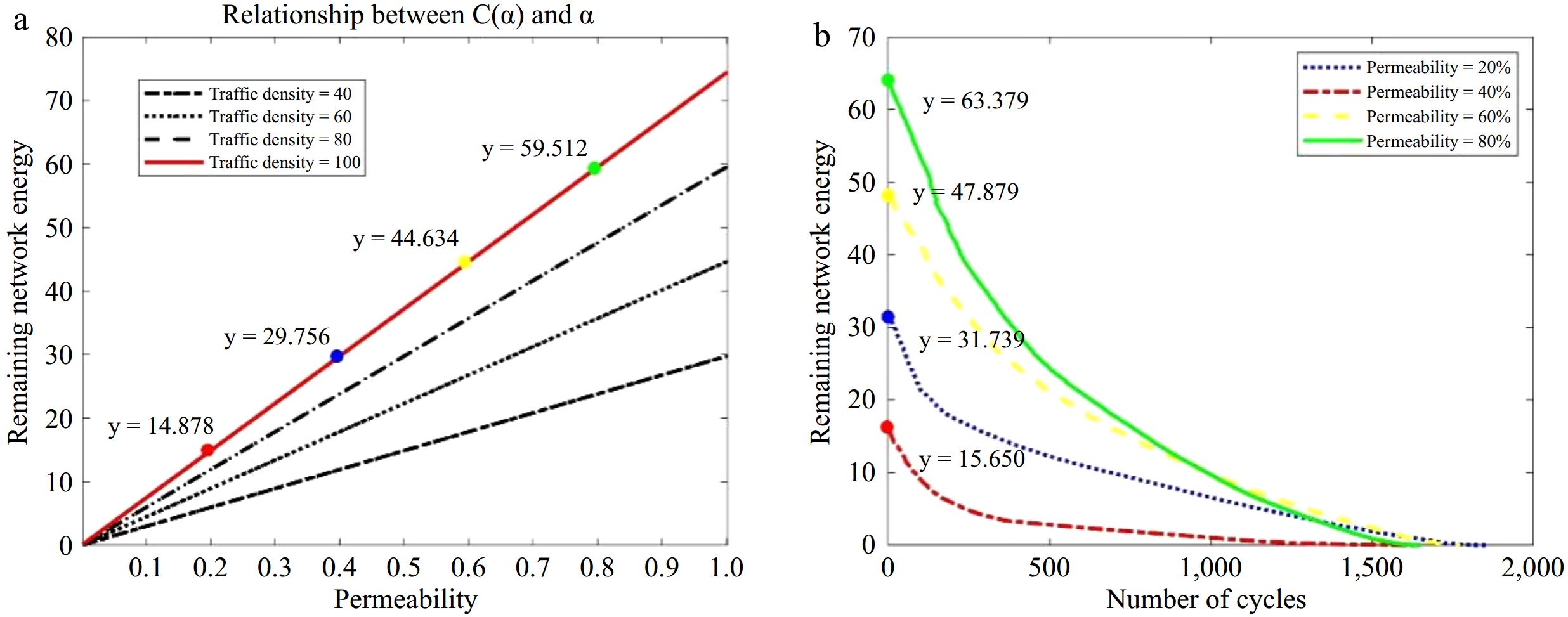 In the segment dedicated to the deficiency test of information transmission, the model's reliability is confirmed through simulation using the cluster-based routing protocol. The model's performance at a traffic density of 100 is validated, as indicated by the red curve in Fig. 8a. Within a simulated area measuring 40 m × 100 m, 100 vehicle nodes are dispersed at random, with subsets of 20, 40, 60, and 80 nodes being arbitrarily chosen to represent smart connected vehicles. The depletion due to information exchange among nodes is emulated with a clustering algorithm, yielding outcomes of 15.650, 31.739, 47.879, and 63.379, as illustrated in Fig. 8b, aligning closely with the model's projected values.