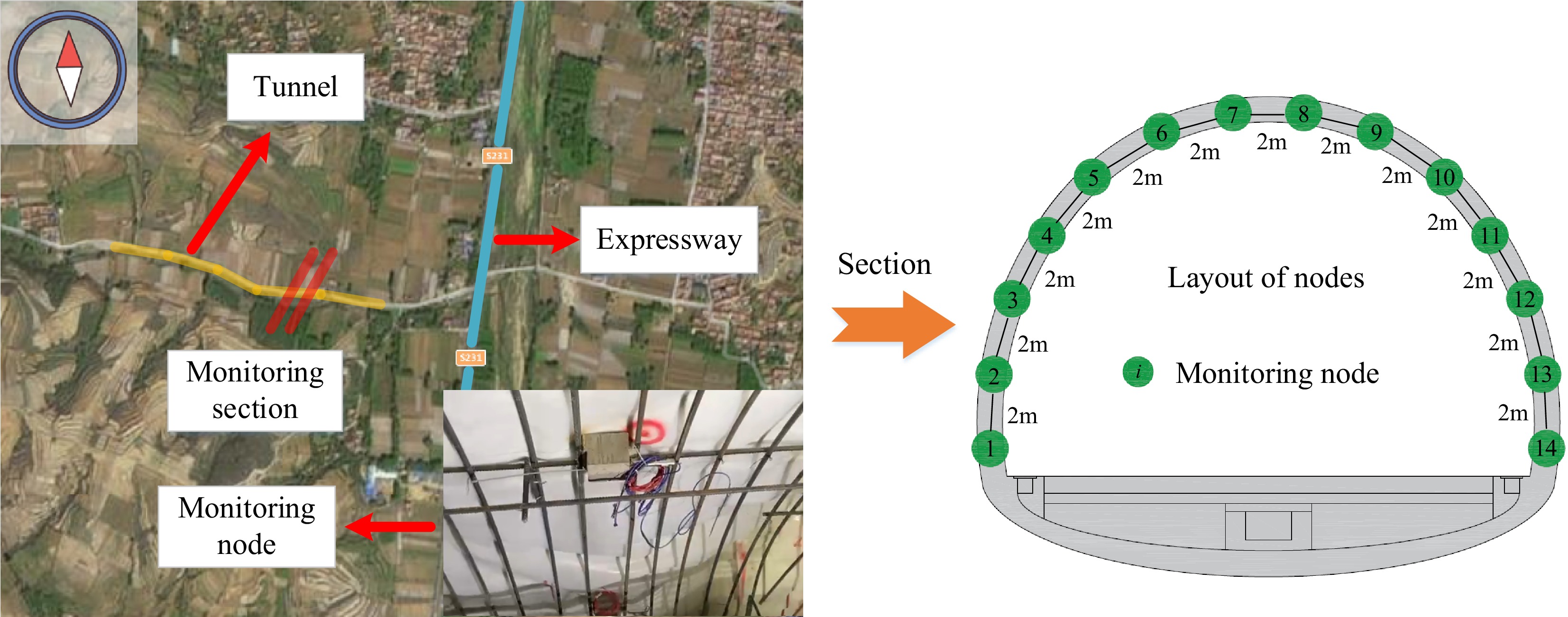 To validate the accuracy of the proposed model, a tunnel located in Shandong Province, China, was selected as a typical case study. The tunnel achieved full completion in January 2024 and is a newly constructed tunnel. However, it traverses challenging terrain with frequent changes in rock mass quality and is also an exceptionally long tunnel. It is necessary to conduct real-time deformation monitoring. The deformation monitoring system was installed on the right side of the tunnel, with monitoring nodes set up every 2 m. The positions and layout of the deformation monitoring system are illustrated in Fig. 3.