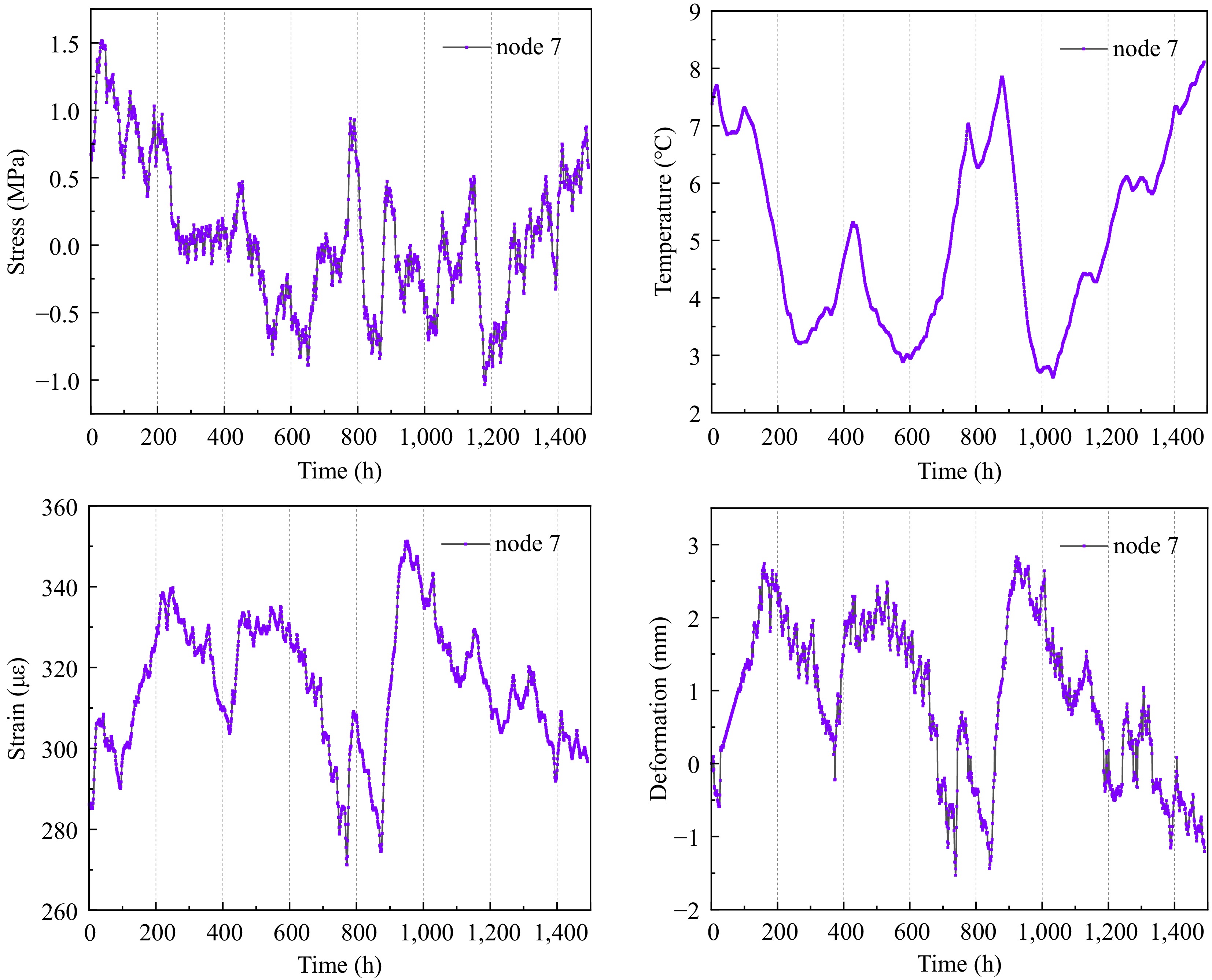 The data collection frequency is once per hour, with each monitoring node containing four types of data: stress, strain, temperature, and displacement. Figure 4 shows the monitoring data at node 7, located at the crown of the tunnel. Since the sensors were installed during the initial lining stage of the construction period, the initial monitoring values obtained at the start of the monitoring system's operation are used as the baseline values for data analysis. The data illustrated fluctuations from the first day of tunnel operation until the end of March. It can be observed that the data for each factor exhibited periodic variations and showed significant correlations. Specifically, stress and temperature were negatively correlated with deformation, while strain was positively correlated with deformation.