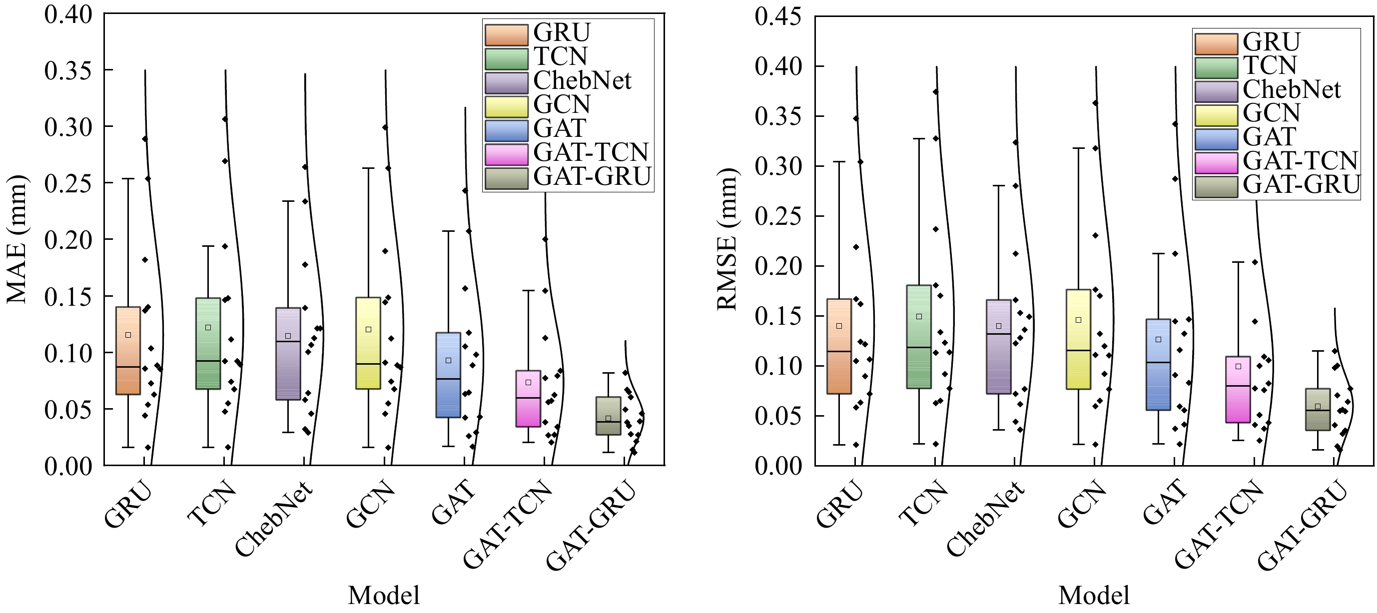 Model MAE (mm) RMSE (mm) GRU 0.115 0.14 TCN 0.122 0.149 ChebNet 0.115 0.14 GCN 0.12 0.146 GAT 0.093 0.126 GAT-TCN 0.074 0.099 GAT-GRU 0.042 0.059 The comparison of different models reveals that the coupled GAT-GRU model demonstrates the best-fitting performance in testing. Its MAE and RMSE are 0.042 and 0.059 mm, respectively, representing an improvement in accuracy of 43.2% and 40.4%, compared to the GAT-TCN model. Furthermore, single temporal or spatial prediction models struggle to predict tunnel deformation effectively. In terms of temporal prediction models, the GRU model exhibits stronger temporal dependency than the TCN, resulting in higher prediction accuracy. As for spatial prediction models, the GAT model outperforms the GCN and ChebNet models, with a decrease in MAE of over 0.1 mm and a decrease in RMSE of over 0.2 mm.