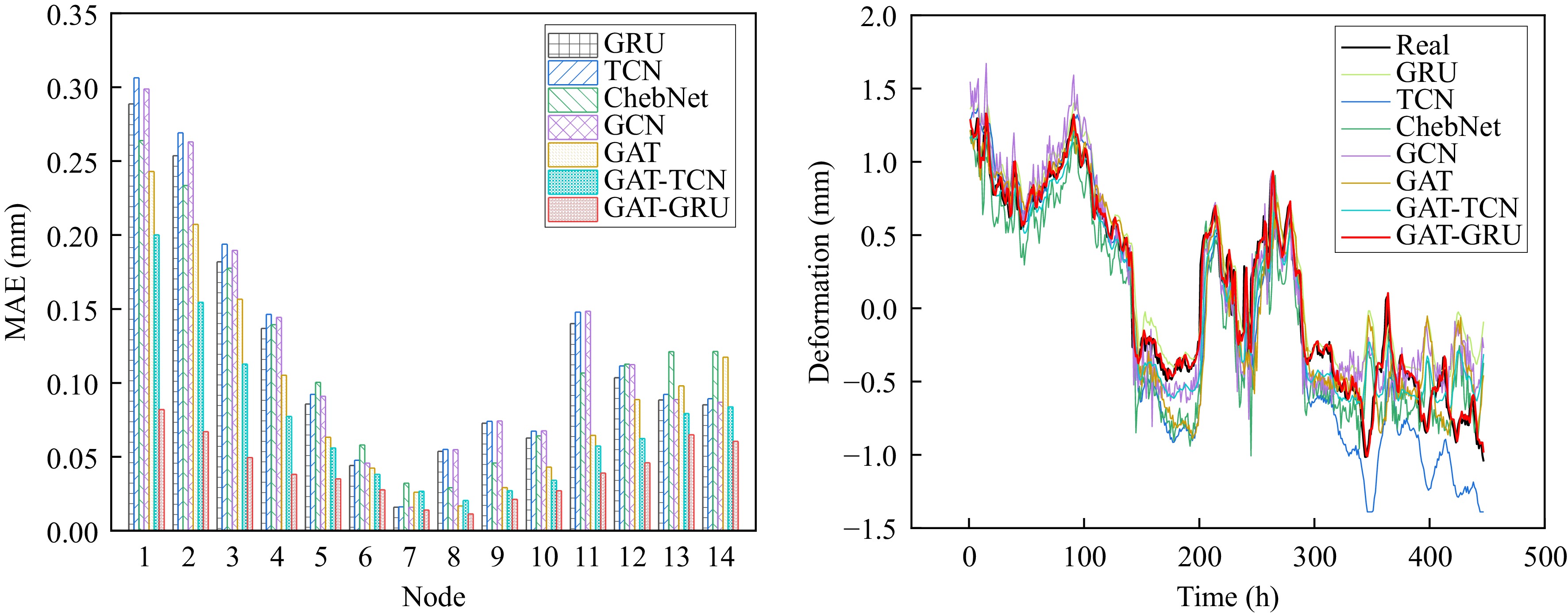 Parameter Range Selected value hidden_feature (GAT) 6, 12, 24 6 num_head (GAT) 2, 4, 6, 8 2 hidden_size (GRU) 64, 128, 256 64 num_layer (GRU) 1, 2, 3 2 learning_rate 0.001, 0.01, 0.1 0.01 batch_size 16, 32, 64 64 num_epoch 50, 100, 150, 200 150 To validate the modeling capability of the GAT-GRU model, a comparative analysis was conducted on the prediction results of other models. A total of two temporal prediction models, three spatial prediction models, and their best-performing combinations were selected. These include GRU, Temporal Convolutional Network (TCN), Chebyshev Network (ChebNet), Graph Convolutional Network (GCN), GAT, GAT-TCN, and GAT-GRU. Table 2 shows the average predictive capabilities of different models for all monitoring positions. When MAE and RMSE are smaller, it indicates that the model has better predictive performance.