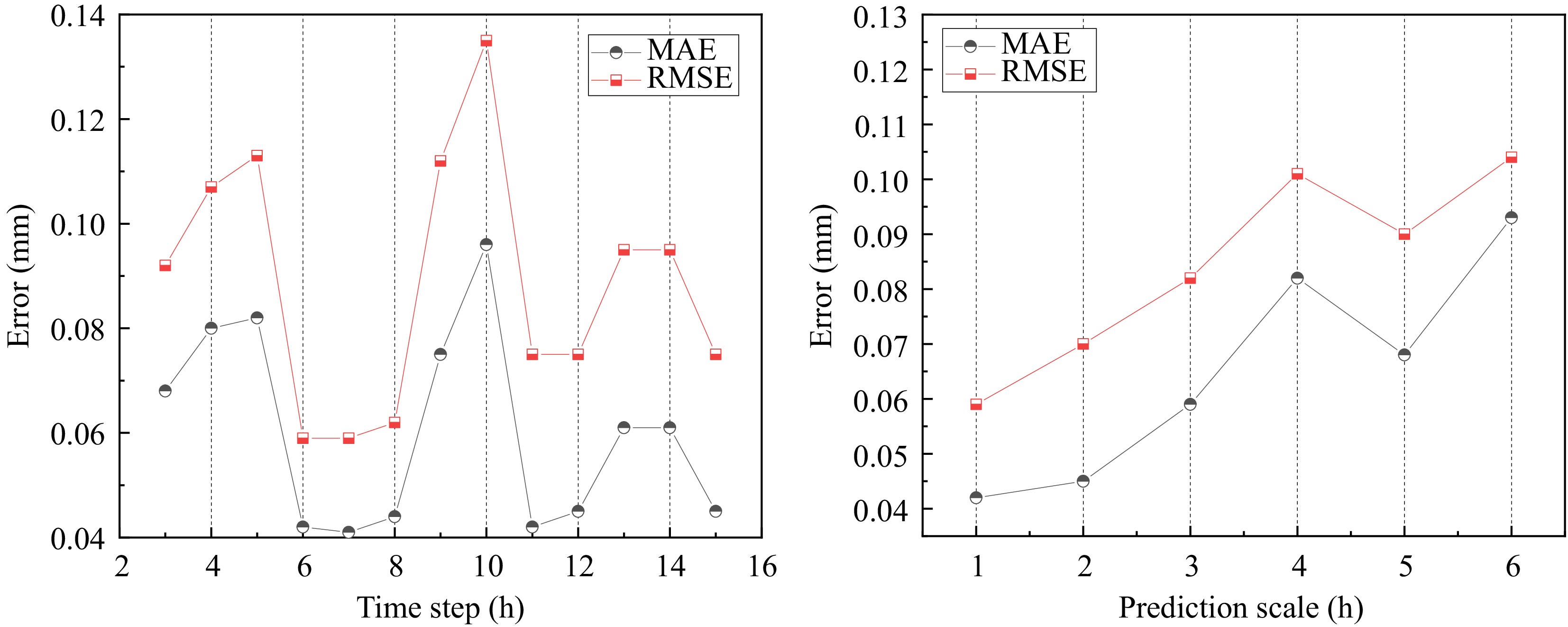Afterward, the impact of different prediction scales on the fitting effect was discussed. Setting the time step to 6 h, the model error was analyzed for prediction scales ranging from 1 to 6 h, as shown in Fig. 7b. The results indicate that with the increase of the prediction scale, the error shows an overall increasing trend. When the prediction time is within 5 h, both MAE and RMSE of the model are less than 0.1 mm. This suggests that the predictive performance of the model decreases with increasing time, but within the next 5 h, it is still able to predict tunnel deformations relatively well.