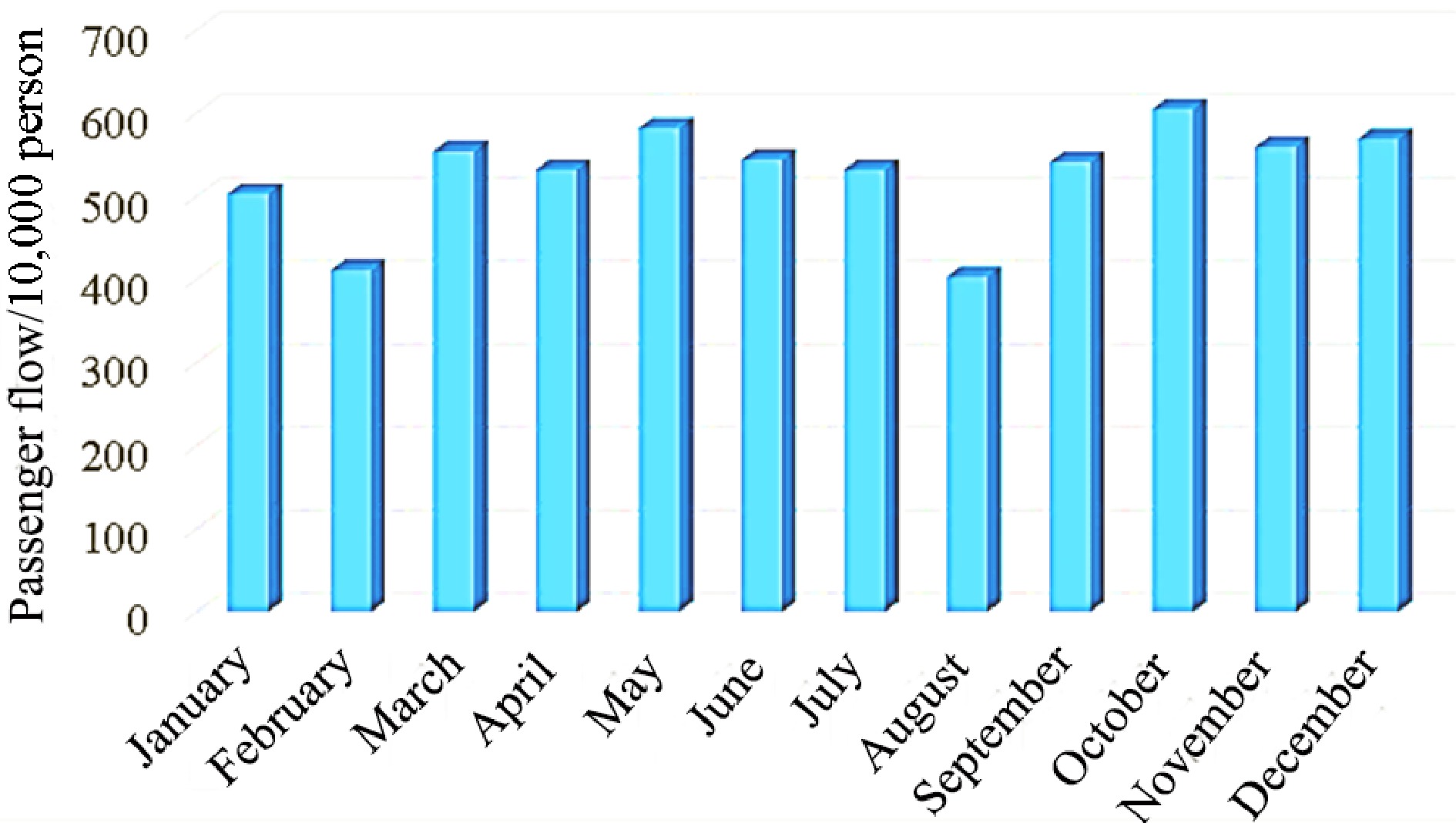 Generally, the hourly distribution of rail transit passenger flow on weekends/holidays and workdays exhibits different distribution characteristics, while monthly rail transit passenger volumes vary with seasonal changes and tourism peaks. The details are depicted in Figs 1 & 2. In addition, it is evident that rail stations near urban centers, adjacent to transport hubs, or commercial centers typically experience higher passenger volumes.