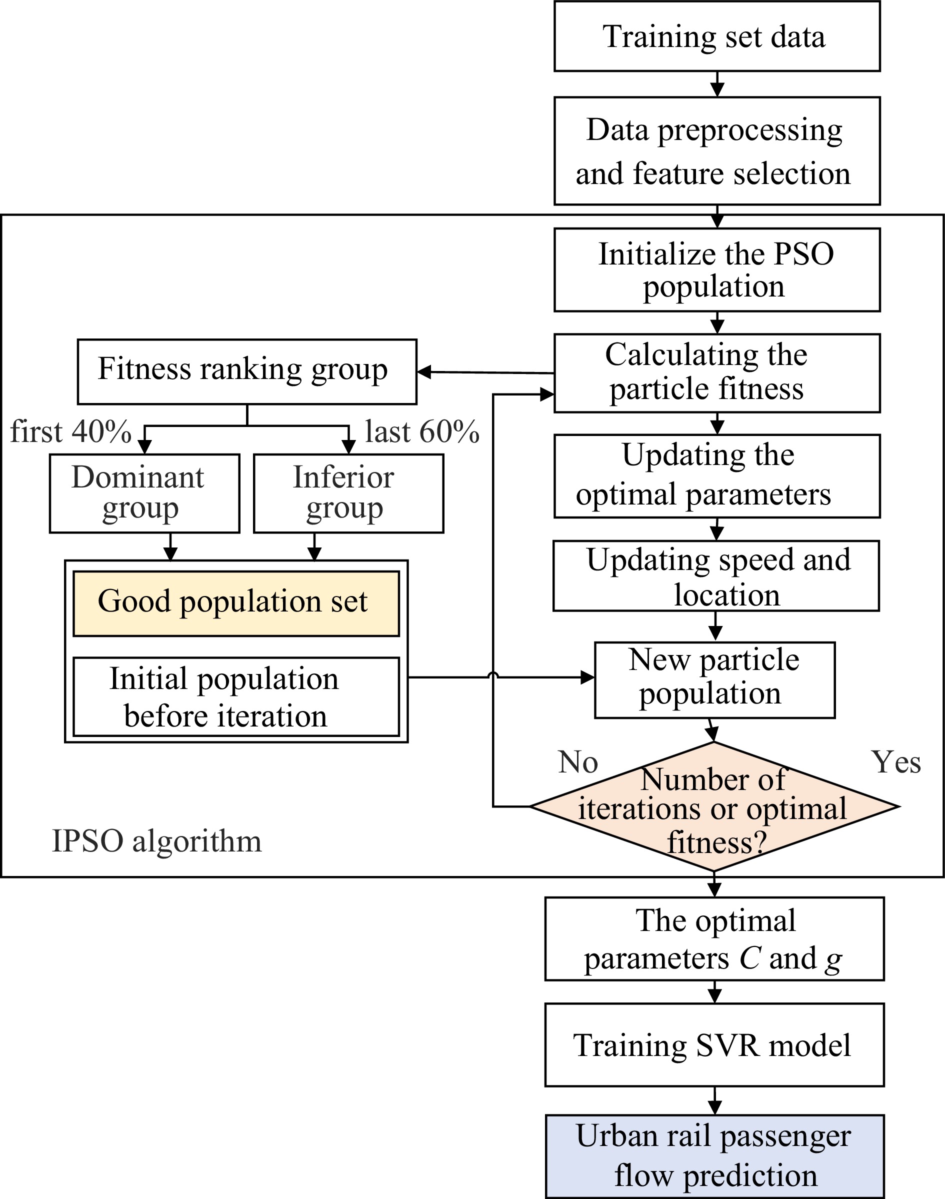 The proposed IPSO algorithm is used to optimize key parameters in the SVR model. To quickly search the optimal values of SVR parameters [XCmin, XCmax] and [Xgmin, Xgmax] based on the PSO optimization algorithm, the search space position thresholds are set within specific limits. Thus, the urban rail passenger flow prediction model based on IPSO-SVR can be constructed. The calculation flow chart of the urban rail passenger flow prediction model based on the proposed IPSO-SVR algorithm is shown in Fig. 3.