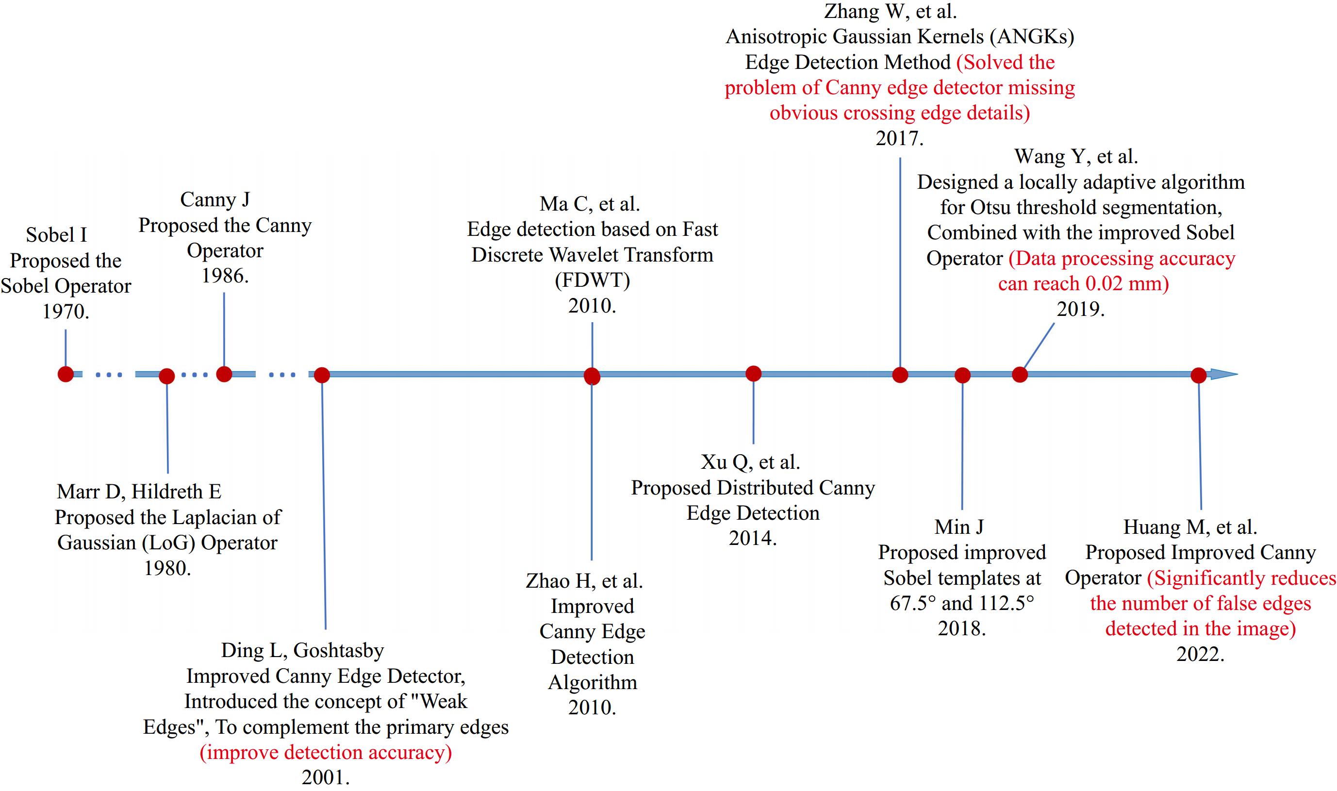 . This algorithm is widely popular.$ \theta =arctan\dfrac{{G}_{y}(x,\;y)}{{G}_{x}(x,\;y)} $ The Canny technique is an important method for detecting image edges, which involves isolating noise from the image before detecting edges. It allows for the application of trends to find the critical values of edges and thresholds without affecting the characteristics of the edges in the image[42]. Subsequently, many researchers have made improvements based on existing algorithms[43−46], Ma et al.[47] introduced a method based on FDWT (fractional differential and wavelet transform). This method effectively enhances high-frequency and mid-frequency signals, and nonlinearly retains low-frequency signals. The FDWT is compared with other operators such as Sobel, Prewitt, and LoG to prove its performance[48]. Even in noisy images, this procedure is effective for different road crack images. Min[49] used new templates in the direction of 67.5° and 112.5°, called the improved Sobel template, to obtain the image edge after image preprocessing. Wang et al.[50] designed a local adaptive algorithm for Otsu threshold segmentation, and combined it with the improved Sobel operator to remove isolated noise points, thereby extracting crack edge information and improving the positioning accuracy of the crack boundary. Zhao et al.[51] used the Mallat transform to enhance unclear edges, and used GA to obtain a better adaptive threshold Canny algorithm. Huang et al.[52] used statistical filtering to solve the problem of blurred image edges; then based on the operator's 3 × 3 gradient template, the gradient magnitude and direction of the pulse string image were calculated. The image threshold is obtained using a natural iterative method, and the discontinuous edges are repaired using morphological closing operations and thinning operators to obtain the final detected edges. In response to the phenomenon of false edges or missing edges in image edge detection operators, an improved Canny operator edge detection method is used. Figure 6 is a development chart of edge detection technology.
