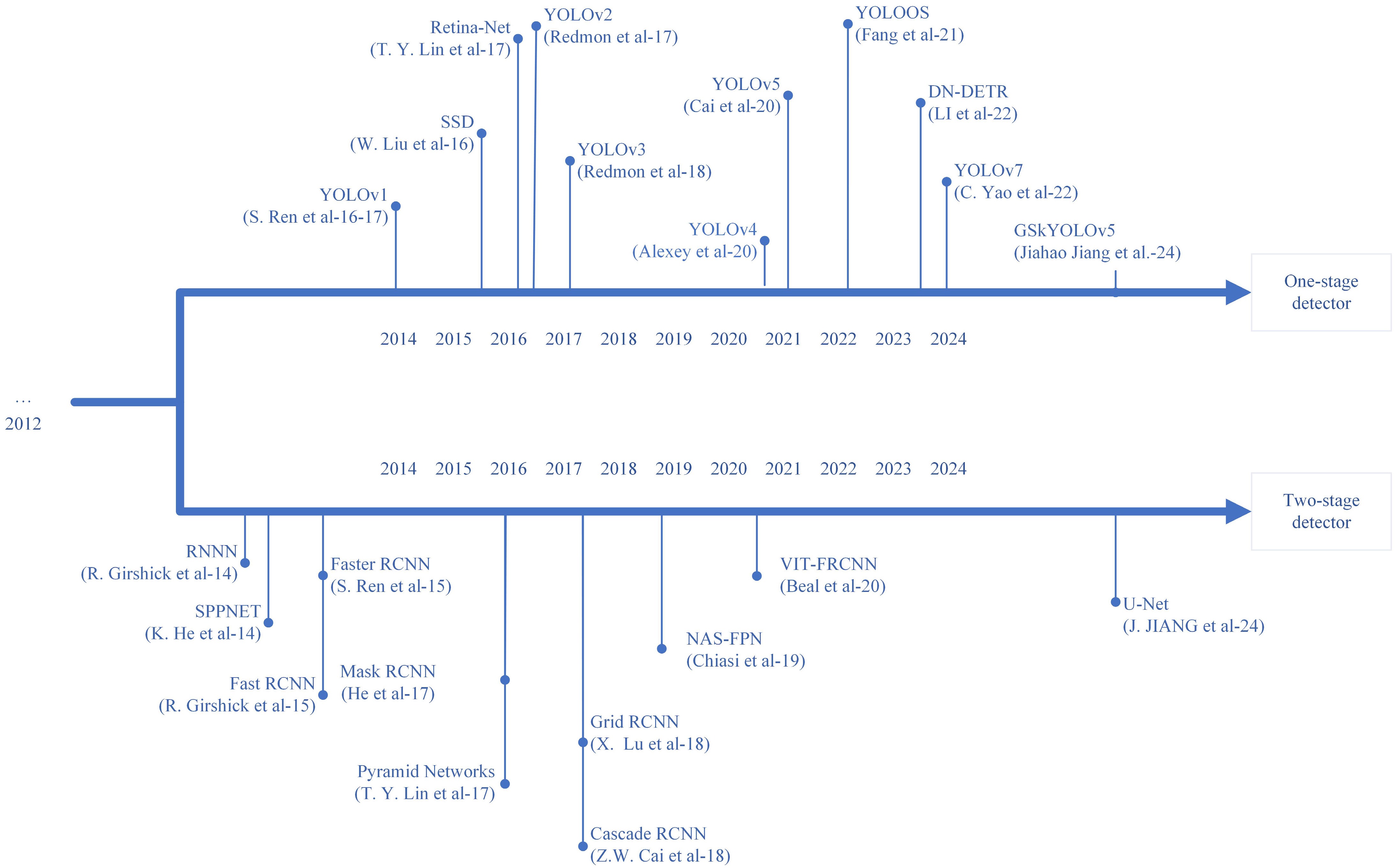YOLO[61] is a real-time object detection algorithm that transforms the object detection task into a regression problem, achieving fast detection speed. YOLO can be used for real-time monitoring and detection of cracks in structures, issuing timely warnings. The detected cracks are classified by generating bounding boxes to accurately locate the position of the cracks. Its advantage lies in its real-time detection capability and speed. The entire network only requires a single forward propagation, which is computationally efficient. However, it has a weaker detection capability for small objects because it relies on grid cells to predict bounding boxes. Finetuning of the network structure is necessary to adapt to different detection tasks. Figure 7 shows the development history chart of deep learning models.