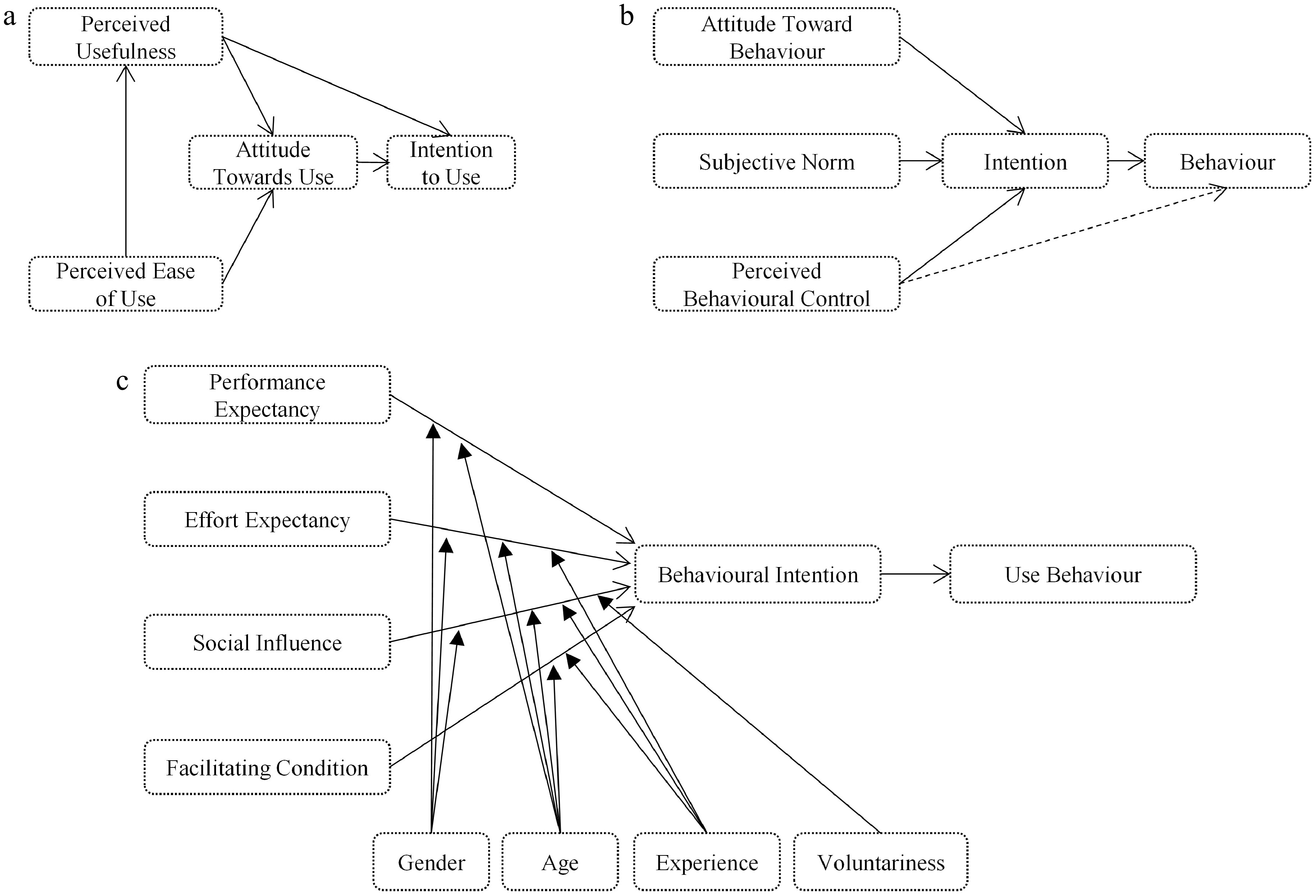 The three main adopted categories of behavioural theories. (a) TAM, (b) TPB, and (c) UTAUT.