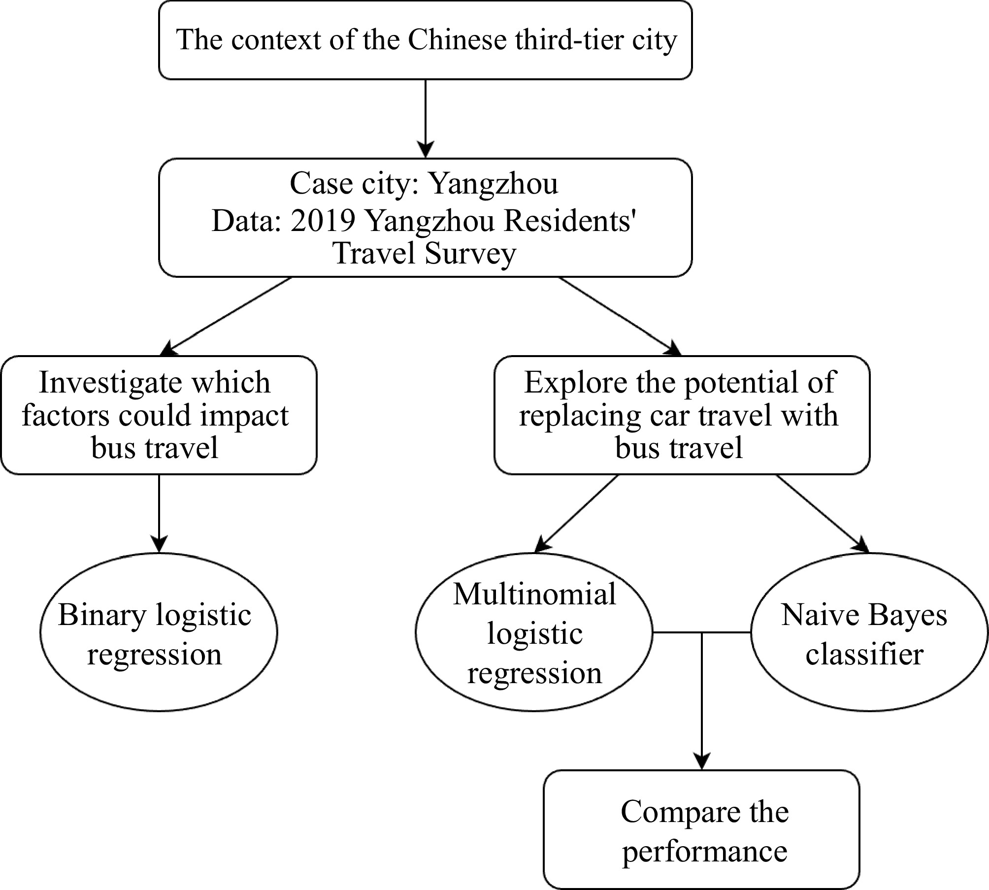 • This study introduced the background of the neglected Chinese third-tier cities and used data from the 2019 Yangzhou Residents' Travel Survey with 7,666 valid samples. Binary logistic regression was selected to investigate which factors could impact bus travel. Then, multinomial logistic regression and the Naive Bayes classifier were adopted to explore the potential of replacing car travel with bus travel. There are three key findings. First, this study examined the impact of socio-demographic and travel behaviour factors on daily bus use. Focused on socio-demographic characteristics, females, older adults, respondents with lower annual incomes, respondents who lived downtown, and respondents without cars were more likely to travel by bus. Focused on travel behaviour factors, respondents with less walking time to bus stops (≤ 5 min), less average waiting time for buses (≤ 10 min), travelling during the off-peak period, lower average number of trips per day, and longer travel time were more likely to travel by bus. Second, this study investigated the probabilities of people travelling by different travel modes (bus, car, walking, traditional bike, and e-bike) for different travel times. The goodness-of-fit of Naive Bayes classifiers performed better than that of multinomial logistic regression by comparing the models' accuracy and DIC. Third, according to the output of Naive Bayes classifiers, this study found that bus travel may potentially substitute for car travel when travel time is between 15 and 30 min.