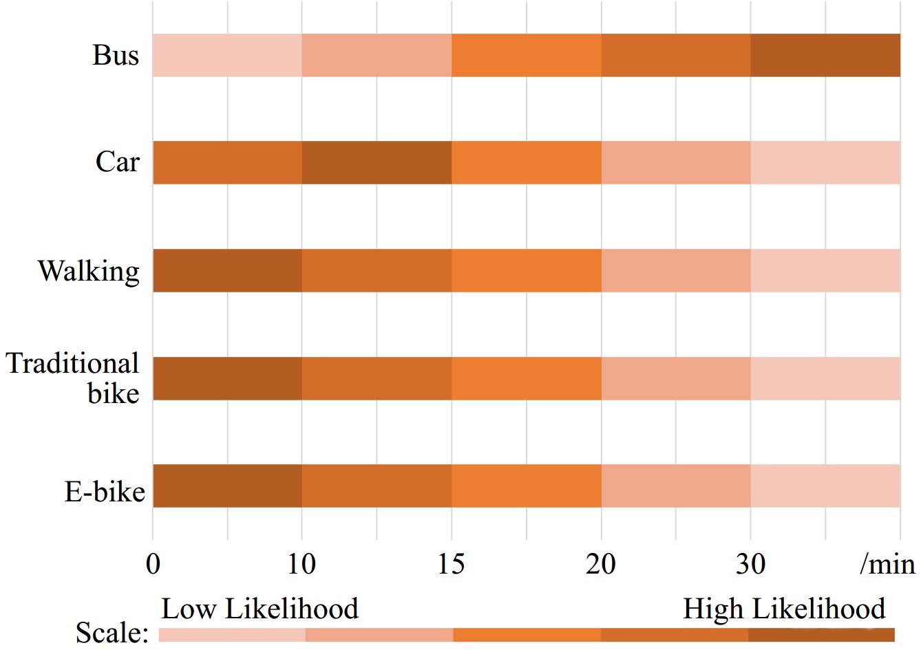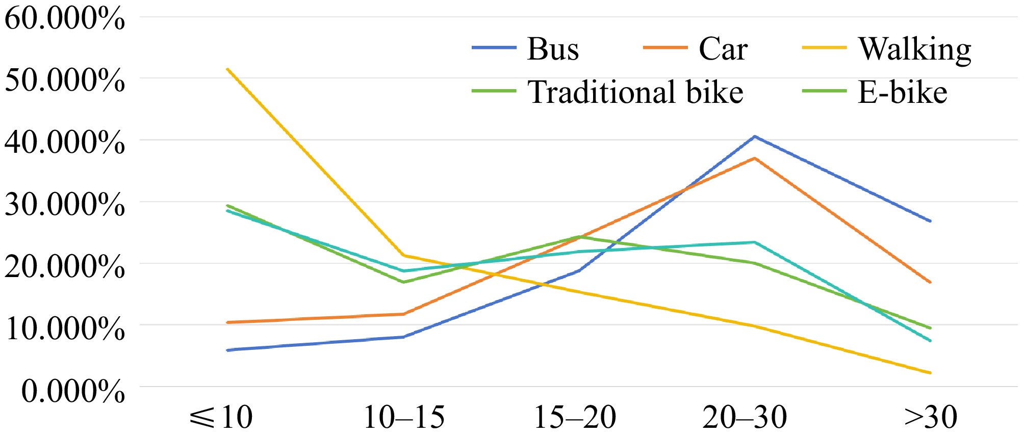 Similar to the discussion, comparing the coefficient B shown in Table 8 was able to compare the likelihood of travelling by different transport modes for different travel times[9,12]. For example, concerning car travel, treating '> 30 min' as the control group, the p-values for other travel time intervals were less than 0.01; the B of the category '≤ 10 min' is 1.002 > 0; the B of the category '10 min < travel time ≤ 15 min' is 1.054 > 0; the B of the category '15 min < travel time ≤ 20 min' is 0.947 > 0; and the B of the category '20 min < travel time ≤ 30 min' is 0.597 > 0. Thus, by comparing the B, the likelihood of travel by car in different travel time ranks from high to low as follows: 10 min < travel time ≤ 15 min, ≤ 10 min, 15 min < travel time ≤ 20 min, 20 min < travel time ≤ 30 min, and > 30 min. In this case, the rank of the likelihood of using other transport modes (walking, traditional bike, and e-bike) for different travel times could also be obtained.