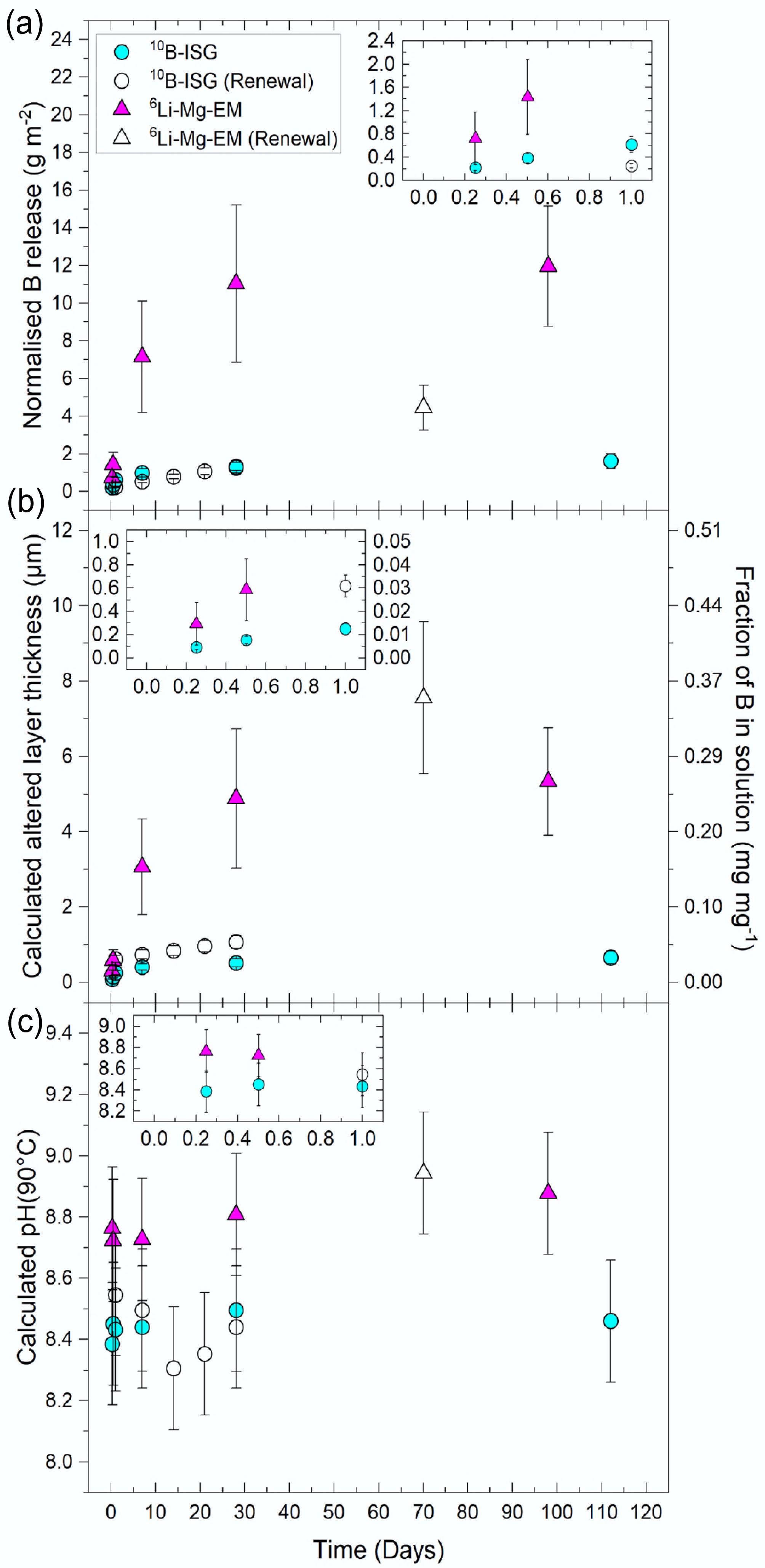 The (a) normalised boron (B) releases, (b) altered layer thicknesses (primary vertical axis) calculated from the leached fractions of B (secondary vertical axis), and (c) calculated solution pH90°C from PHREEQC modelling using the measured solution concentrations as a function of time for 10B-ISG and 6Li-Mg-EM. Normalised B releases were calculated by normalising B concentrations to experiment geometric SA/V ratios and elemental mass fractions of B in the pristine glasses. Points are given as averages (n ≥ 3), with uncertainties on (a) and (b) propagated from 1SD associated with the concentration measurements, geometric surface areas and pristine glass compositions (26.7% relative SD for 6Li-Mg-EM, 15.5% relative SD for 10B-ISG). Uncertainties on the calculated pH90°C values are given to ±0.2 pH units, with this uncertainty encompassing the calculated pH value ranges obtained from the uncertainties associated with the measured solution concentrations used in calculating these pH90°C values (data not shown). Insets in each subplot include the same data but at times of up to 1 d. Altered layer thicknesses for the solution renewal experiment samples are presented as cumulative values that include the initial 28 d before renewal.