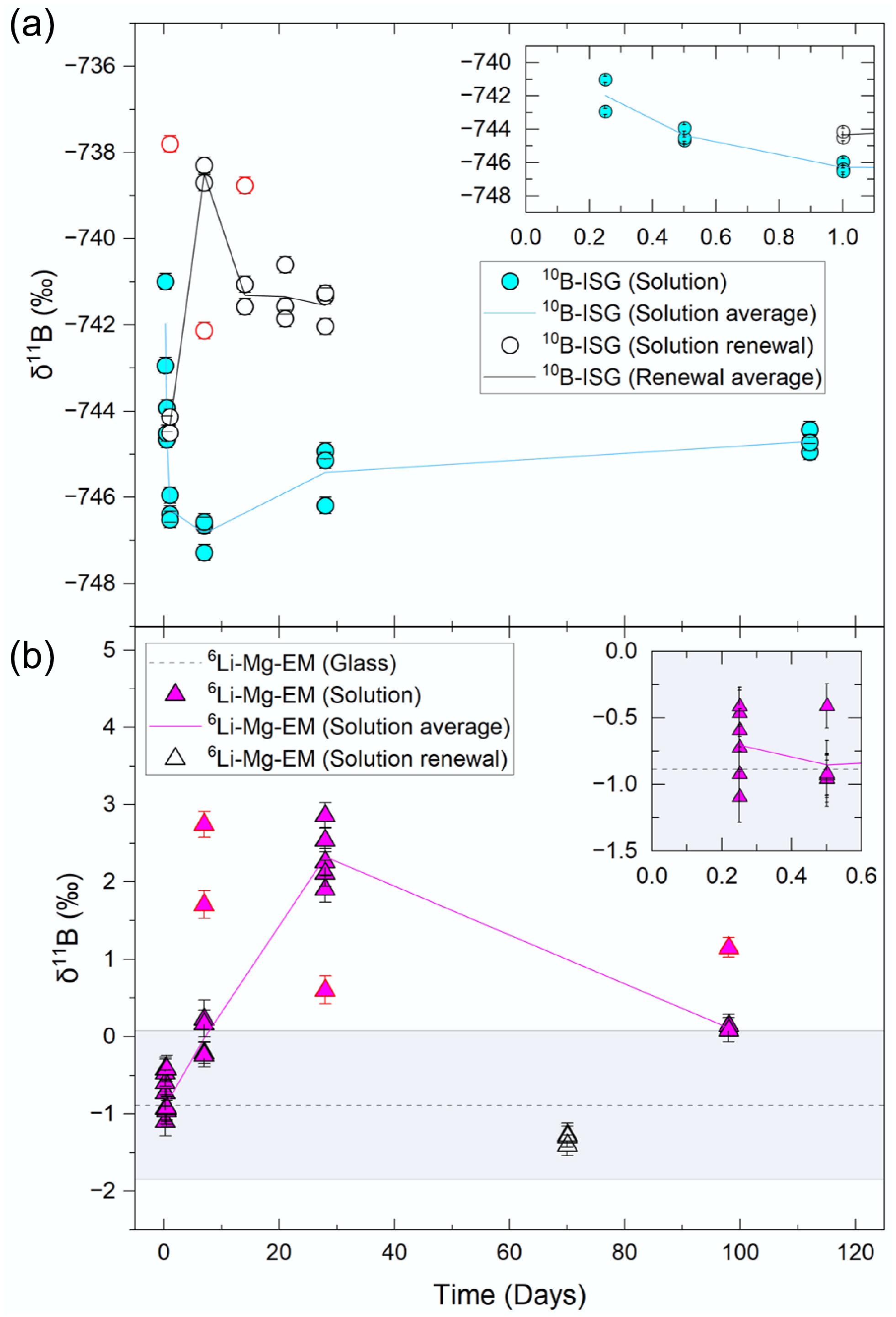 Solution δ11B values for the (a) 10B-ISG and (b) 6Li-Mg-EM experiments relative to their respective pristine glass values. Individual points are given for each aliquot analysed, with uncertainties given to 2SD. Outliers are shown as points with red borders. Lines represent the mean value of all aliquots (excluding outliers) at a given time. The measured pristine glass value is shown for 6Li-Mg-EM as a dotted line (mean) with the shaded region representing the uncertainty (2SD) associated with this value. The measured pristine glass value for 10B-ISG (−767.54 ± 6.44‰) is not visible on the scale used.