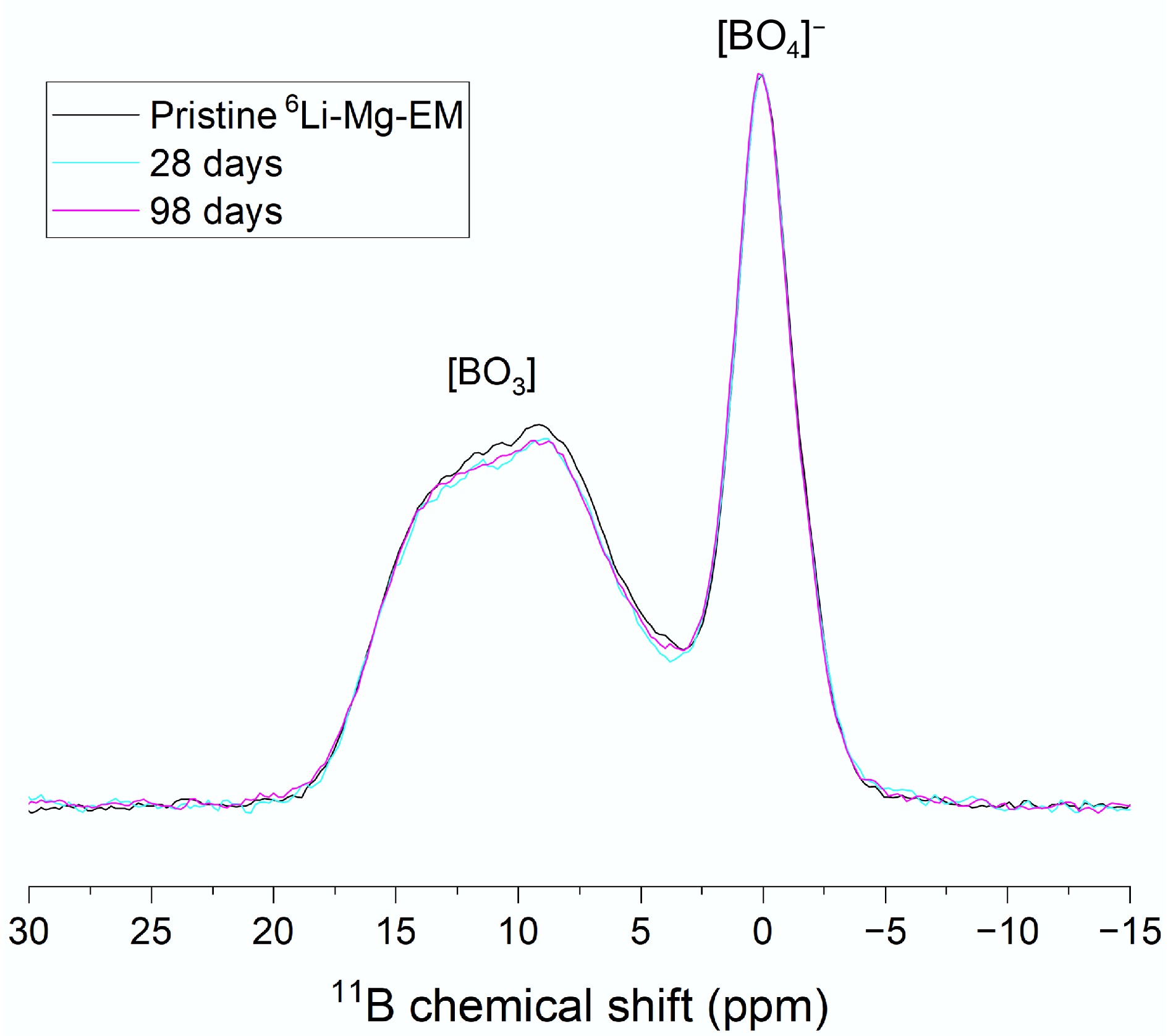 11B MAS-NMR spectra of 6Li-Mg-EM after 0 (black line), 28 (cyan line) and 98 d (magenta line) of alteration. Labels indicate the positions of the [BO4]− unit peaks and the [BO3] unit doublet. Spectra were normalised to a given [BO4]− peak intensity to compare changes in [BO3] doublet intensities.