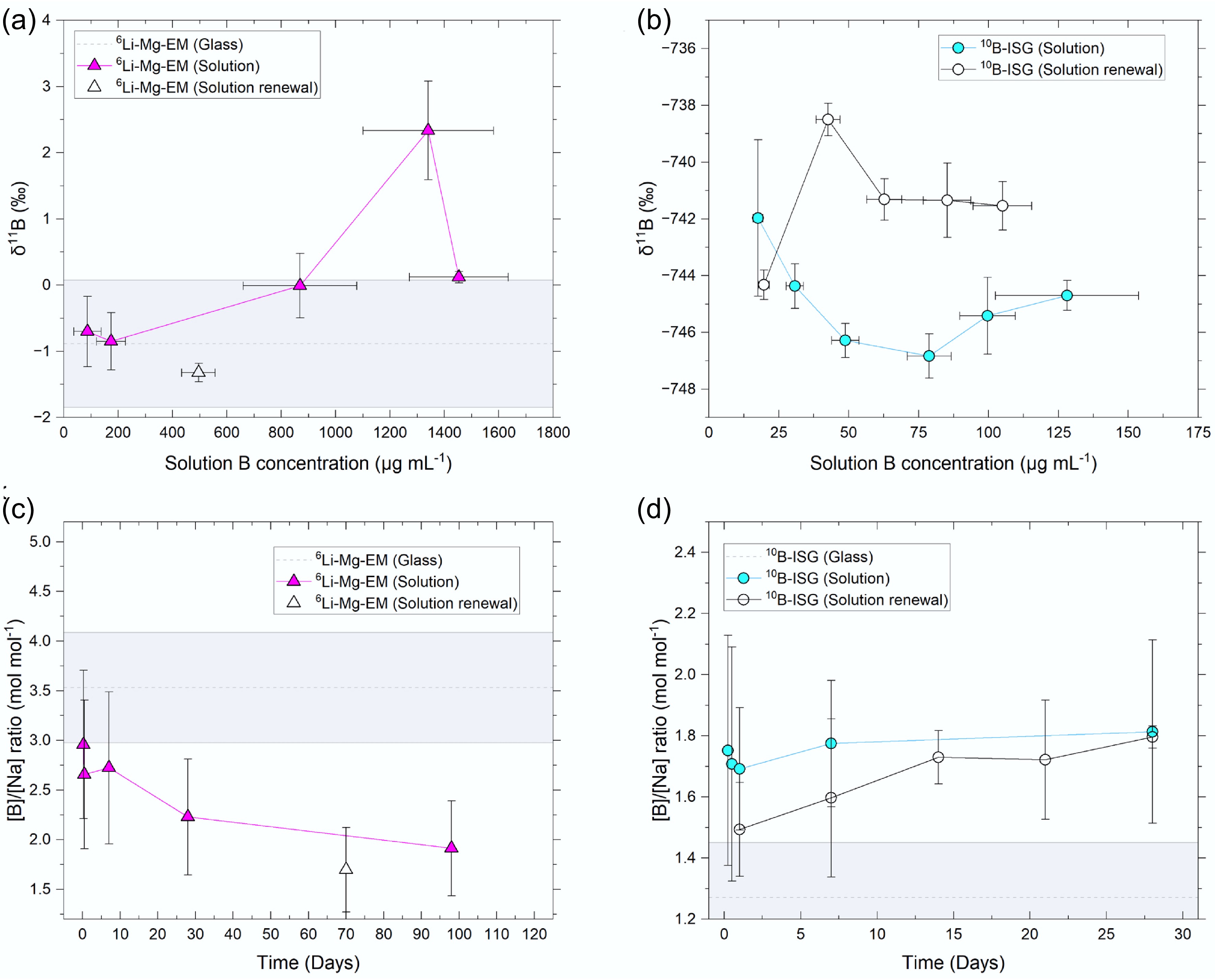 Solution δ11B values plotted against B concentrations for the (a) 6Li-Mg-EM and (b) 10B-ISG experiments, and solution B to Na concentration ratios against time for the (c) 6Li-Mg-EM and (d) 10B-ISG experiments. Uncertainties are given to 1SD on concentrations and 2SD on δ11B values. Measured pristine glass values are shown as dotted lines (mean) with the shaded region representing the uncertainties on the measurements. The pristine glass δ11B value for 10B-ISG (−767.54 ± 6.44‰) was not visible on the scale used.