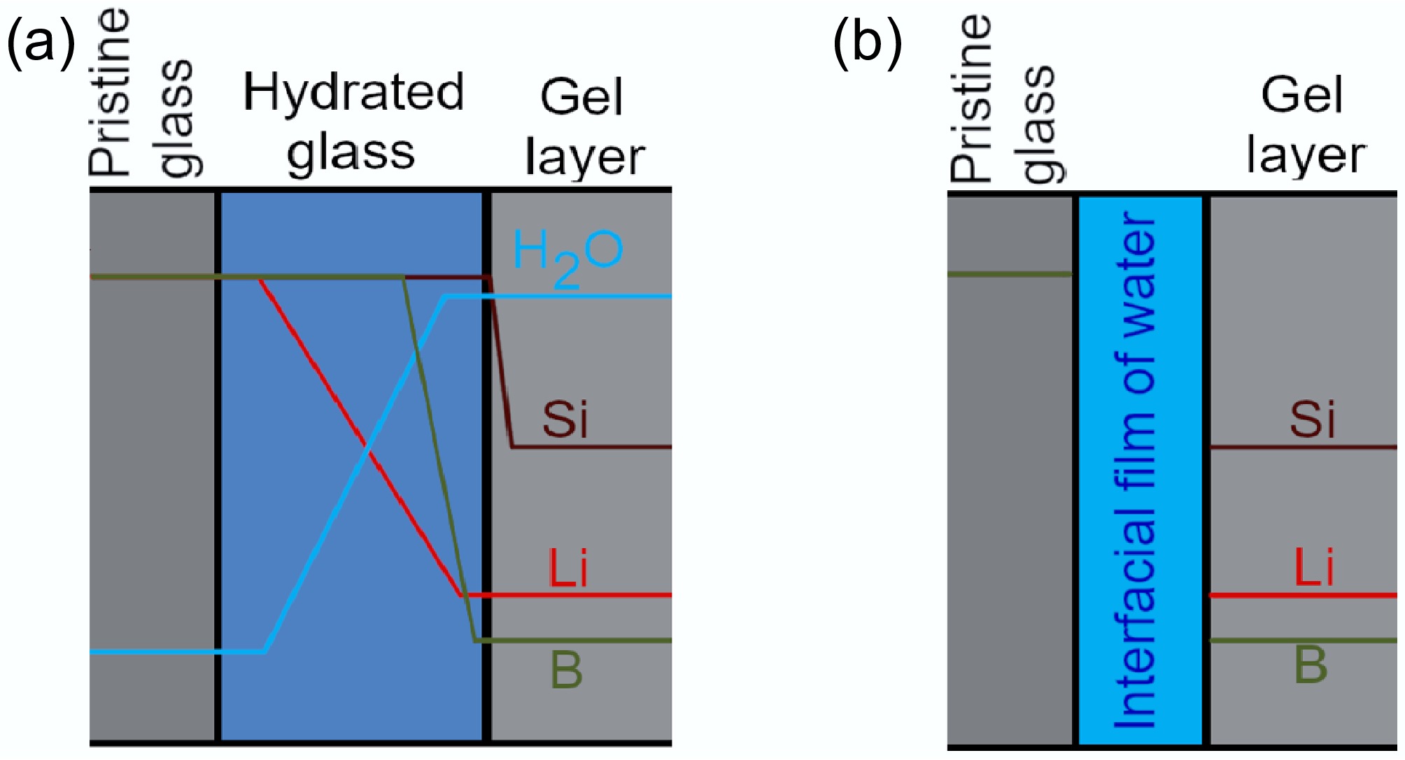 The mechanisms outlined in 'classical' interdiffusion models and the interface-coupled dissolution-precipitation model predict substantially different elemental profiles for mobile glass species (Fig. 5). The former predicts interdiffusion and similarly rapid B hydrolysis lead to a dissolution front for mobile glass species spatially separated from glass network (i.e., siloxane bond) hydrolysis, in turn forming a hydrated glass layer denuded of B, network modifying, and charge compensating species ahead of a gel layer. A component of this hydrated glass layer, such as an 'active zone' at the hydrated glass-gel interface, may undergo densification and porosity clogging through condensation and precipitation reactions to mature in its transport properties to present a nanoporous molecular sieve[17,27]. Contrastingly, following an interface-coupled dissolution-precipitation model, congruent hydrolysis by an interfacial film of water effectively presents a single dissolution front, with a passivating altered layer component later forming behind this front by precipitation[10−13]. Later formulations of this model considered interdiffusion processes, including the solid-state diffusion of reactive water species into the glass, to be rate-limiting at long times[15], wherein elemental dissolution fronts may be spatially separated.