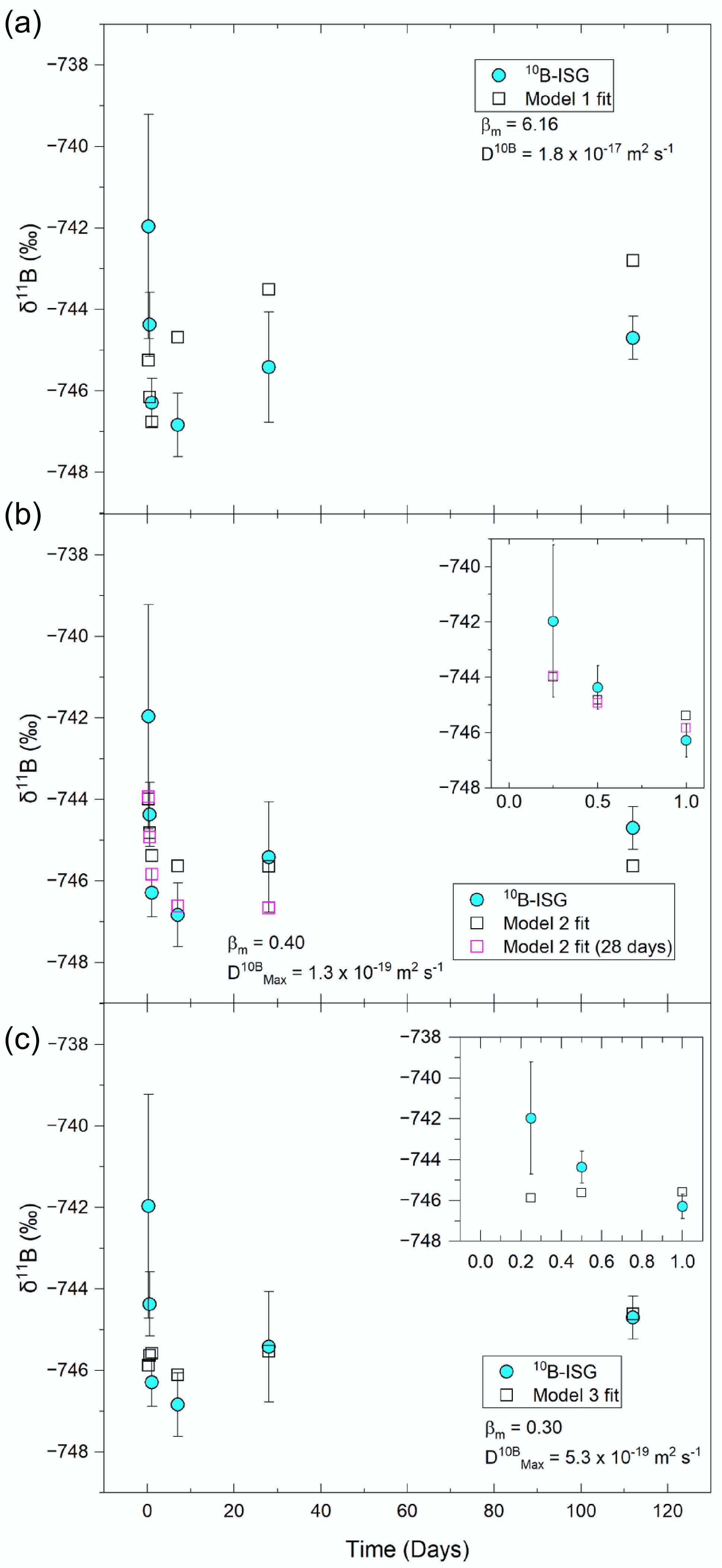 Representative diffusion model fits to the measured 10B-ISG (non-renewal) experiment solution δ11B values using (a) Model 1, (b) Model 2, and (c) Model 3 (data provided in Supplementary Table S2). Model 1 assumed a constant bulk apparent diffusivity of B in the altered layer, Model 2 assumed a bulk apparent diffusivity which was time-dependent, and Model 3 assumed apparent diffusivities were spatially dependent in the altered layer upon access to water species. Fits varied βm and D10B using eB as distance (Model 1), varied βm whilst holding D10BMax using eB-eSi as distance (Model 2), and varied βm, βc, α and D10BMax using eB as distance (Model 3) (data for these fits are given in rows 2, 5 and 7 of Supplementary Table S2, respectively). For Model 2, additional fits are given for the model fitted to the ≤ 28-d data (excluding the 112-d value).